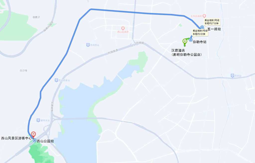 去程:汉庭酒店(昆明弥勒寺公园店)步行→弥勒寺站乘地铁5号线 →五一路站转地铁 3号线 →西山公园站→步行至西山景区游客中心,里程:16.5公里 | 步行1.4公里。
