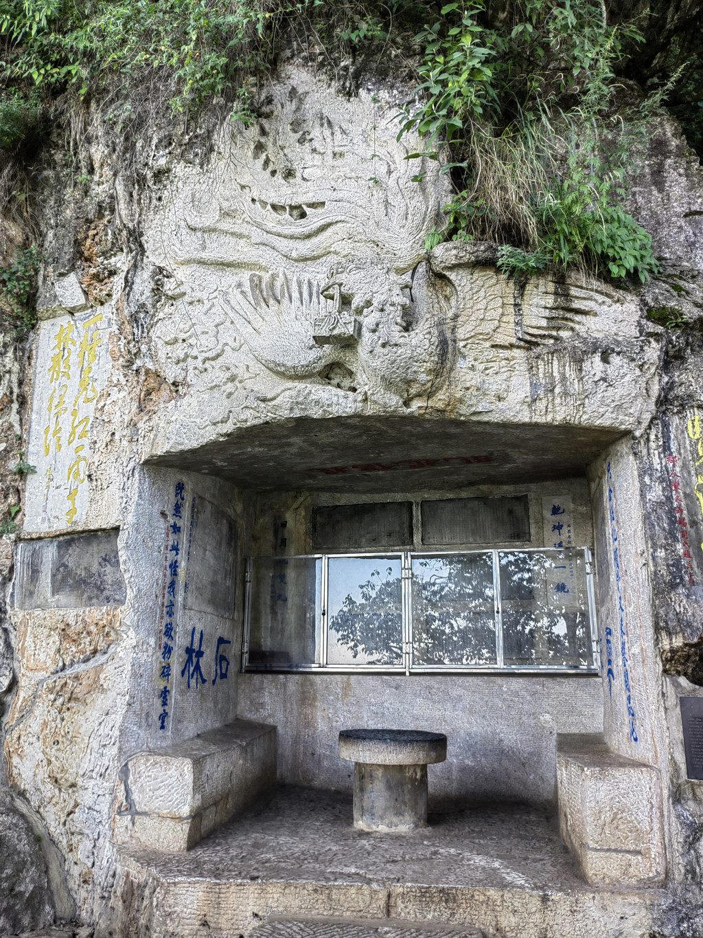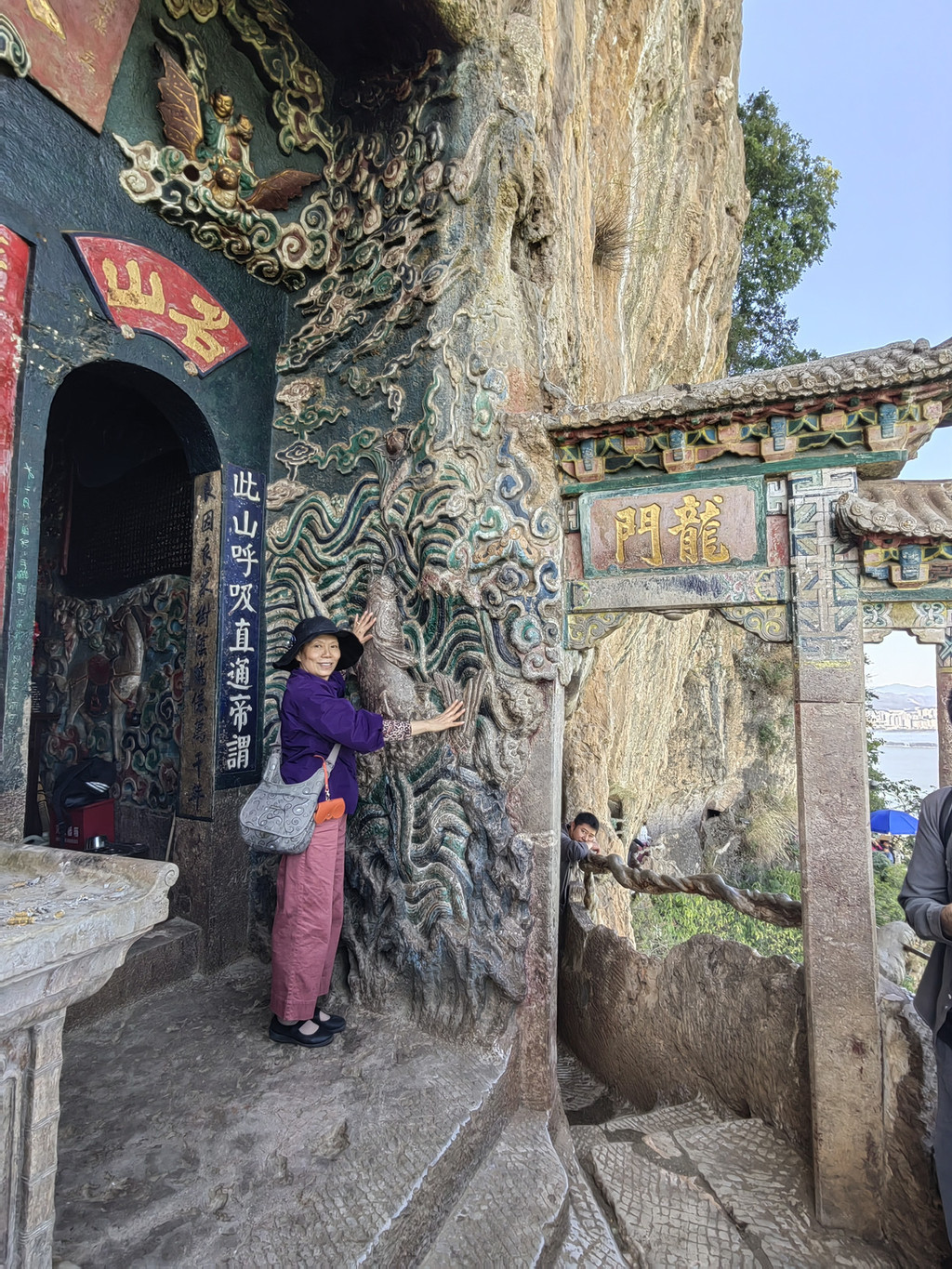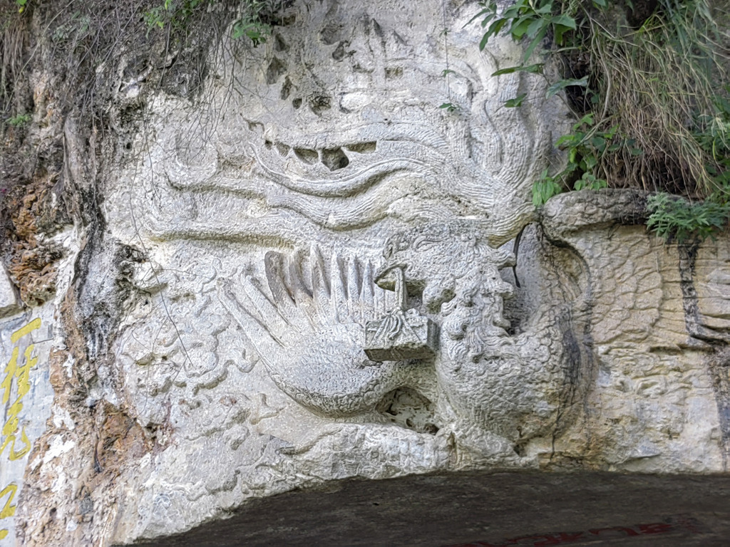 岩壁上雕刻了一条鲤鱼,寓意“鲤鱼跳龙门”,大家都去摸上一下,沾沾福气。