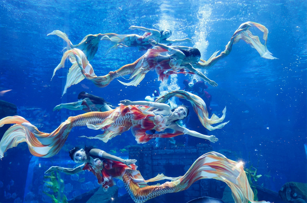 水下大型民俗舞蹈-《人鱼传说·荷塘月色》即将开演,旋律在海底回荡,美人鱼化身水中锦鲤,在荷花与月影间翩跹起舞,缔造穿越千年的东方浪漫奇观,随手一拍必将成为国风名场面!