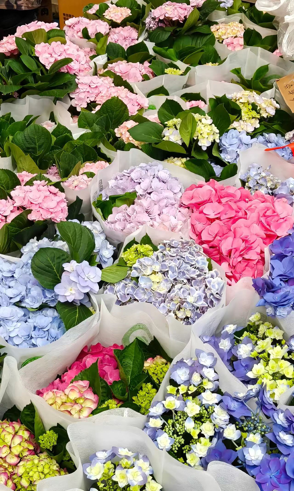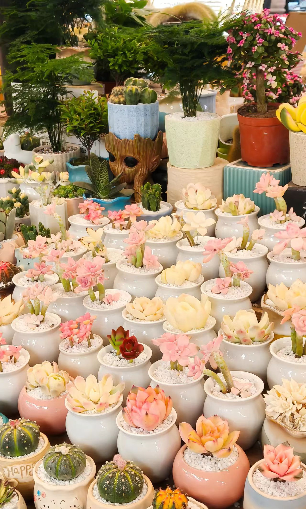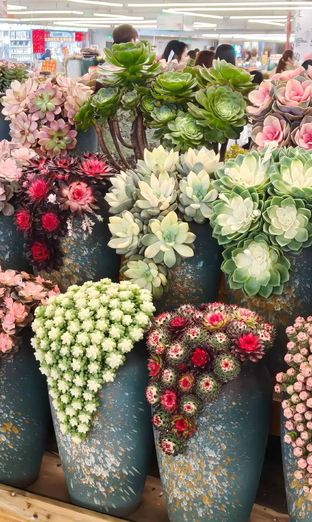 这里的玫瑰有几十种颜色,卡布奇诺的复古、洛神的粉嫩,每一束都像精心调制的油画颜料🎨绣球花团锦簇,蓝色的像梦幻星河,粉色的似少女腮红🌸多肉区更是治愈天堂,10元6颗的普货里,总能挖到造型奇特的老桩,搭配马卡龙色花盆,可爱值拉满🥰