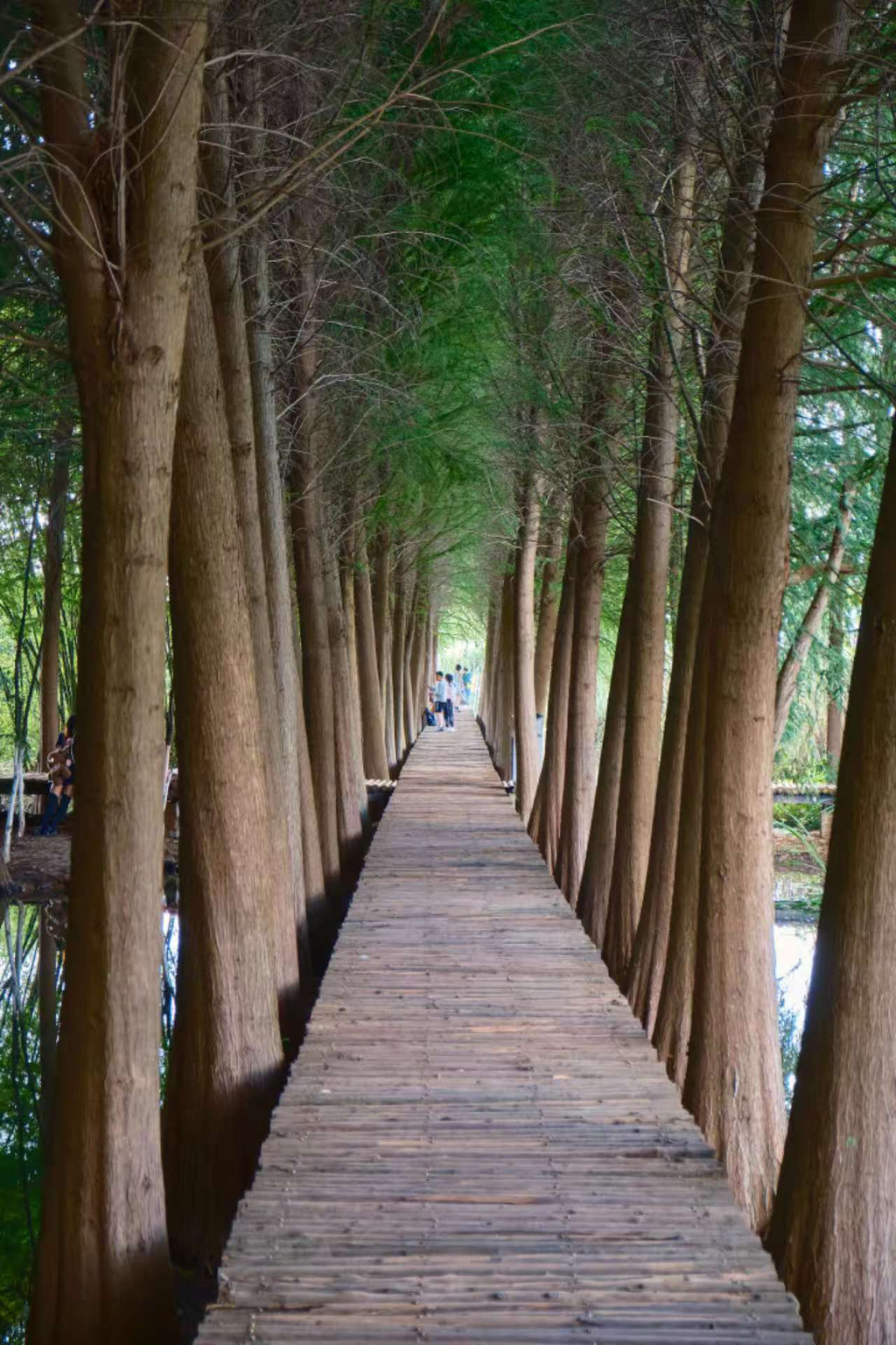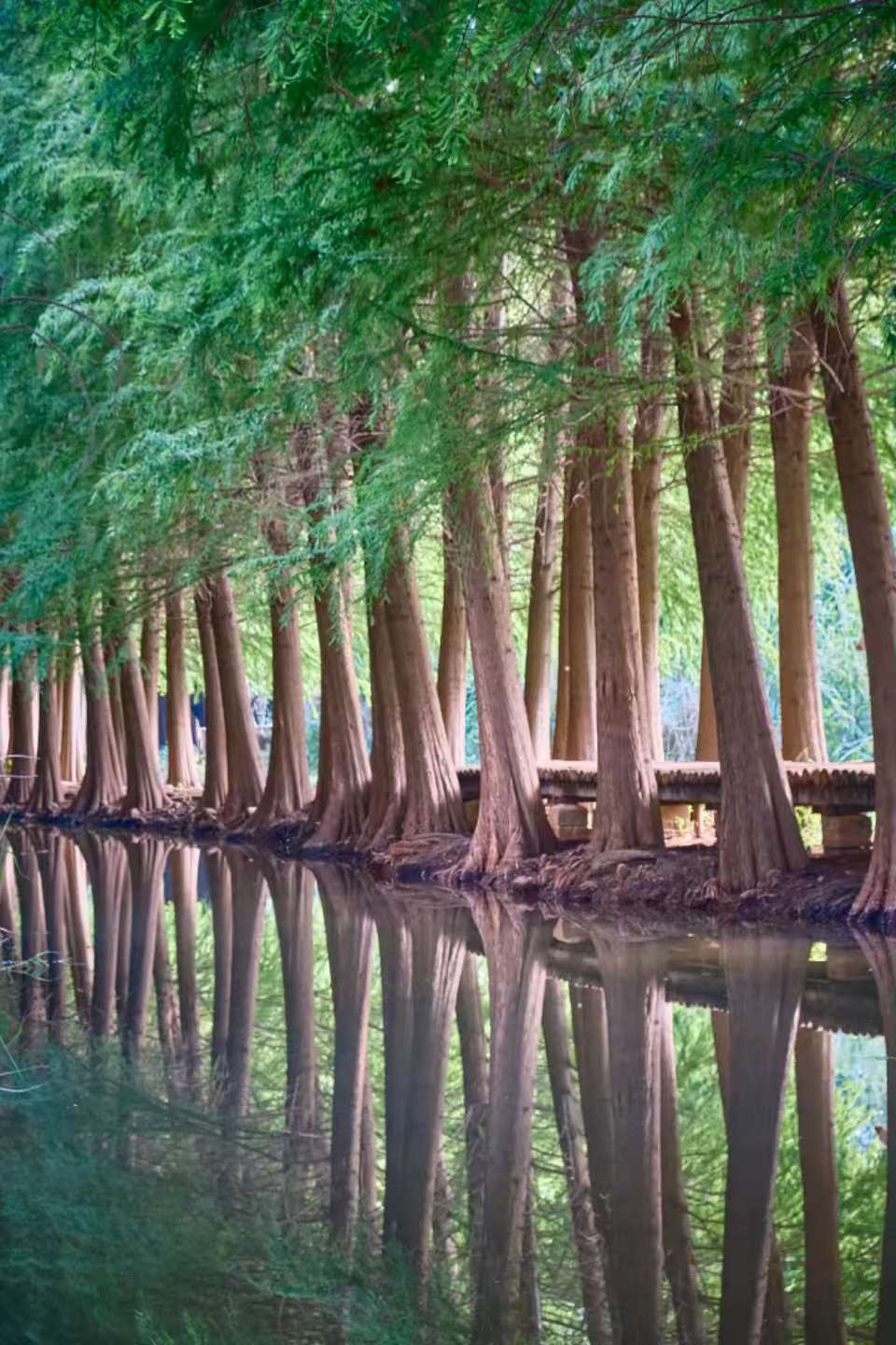 这里的水杉林栈道是绝对的C位打卡点📸,笔直的水杉树列成天然隧道,木板路延伸向绿意深处,随便一拍都是森系大片(图1、2、6)🌲!水面如镜时,水杉倒影对称如画,仿佛闯入童话世界🧚♀️。