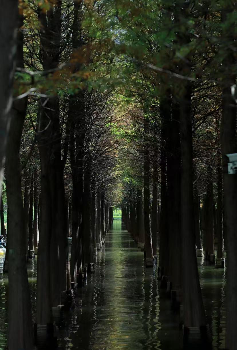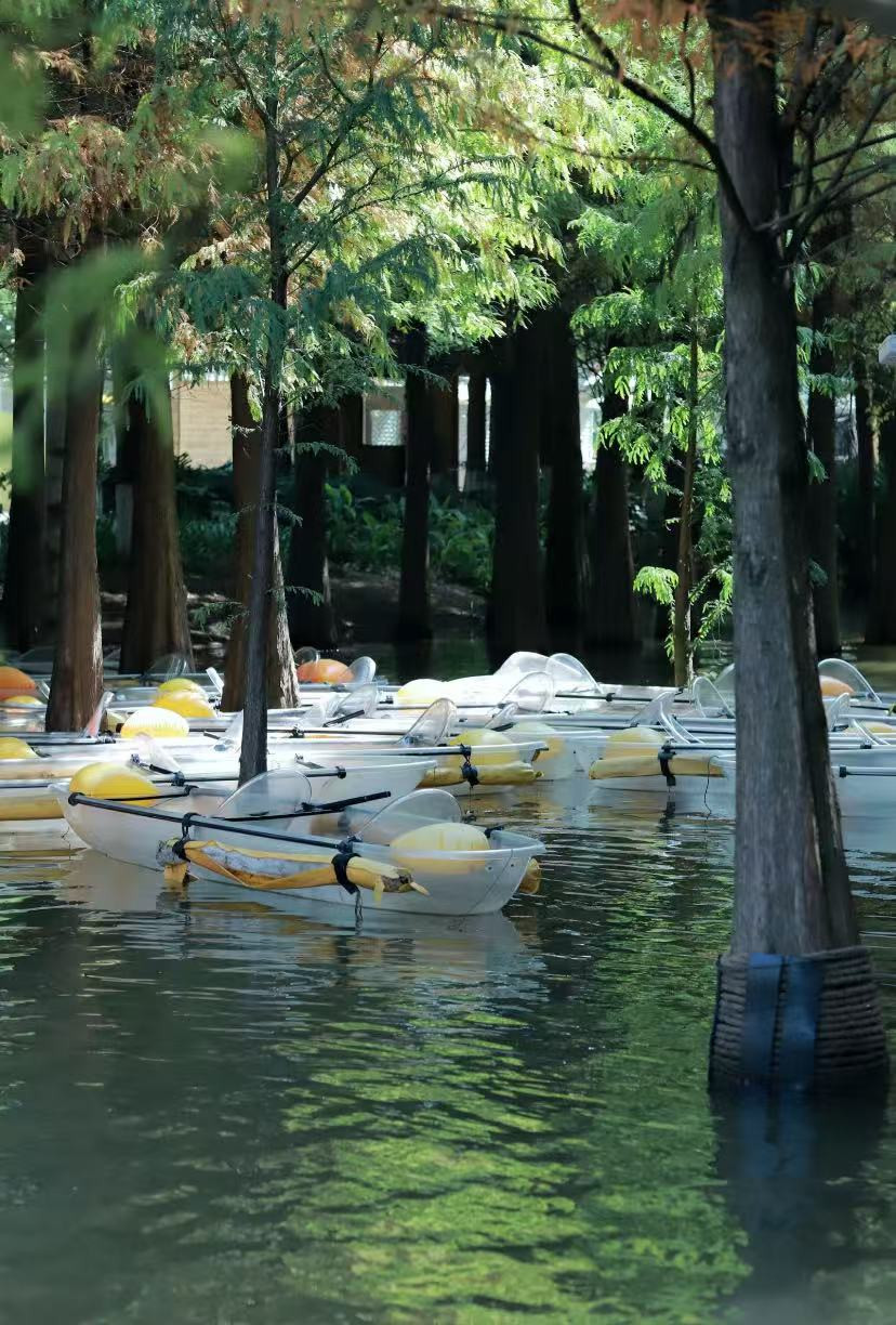 一定要去试试划船哦🚣!透明的小船或者竹筏穿行在水杉林间,船桨轻轻拨开水面,溅起一圈圈的涟漪,低头还能看见鱼群在水中自由自在地游过,这个时候拍照,真的是巨出片📸!(记得穿浅色系的衣服会更上镜哦)。如果不想动的话,租辆单车骑行🚲,或者坐观光车晃悠晃悠,也非常舒服呢。