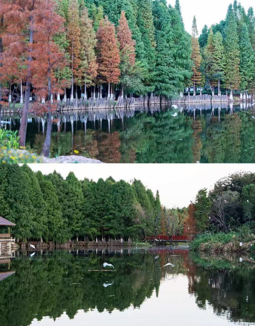 公园里的C位担当,必须是那片水杉林🌲呀!树在水里生长,四季都有不同的“新皮肤”哦。秋冬时节,层林尽染,红的、黄的叶子交织在一起,倒映在平静的湖面上,就像打翻了调色盘一样🎨。再配上成群结队的海鸥在天空中飞过,那画面,每一帧都像是一幅活的油画呢🎨!沿着木栈道慢慢漫步,脚下踩碎落叶,发出沙沙的声音,耳边是悦耳的鸟鸣啾啾,偶尔还会有一只小松鼠从你眼前快速窜过,真的能瞬间萌化你的心🐿️!