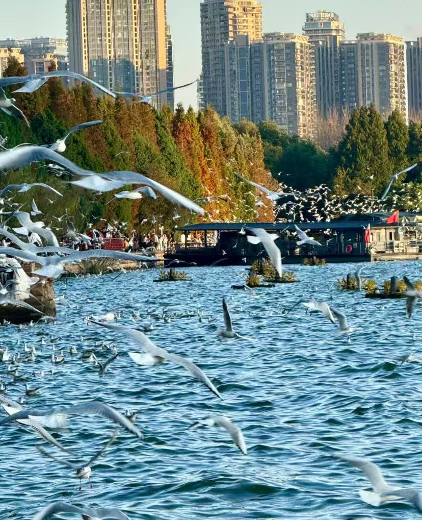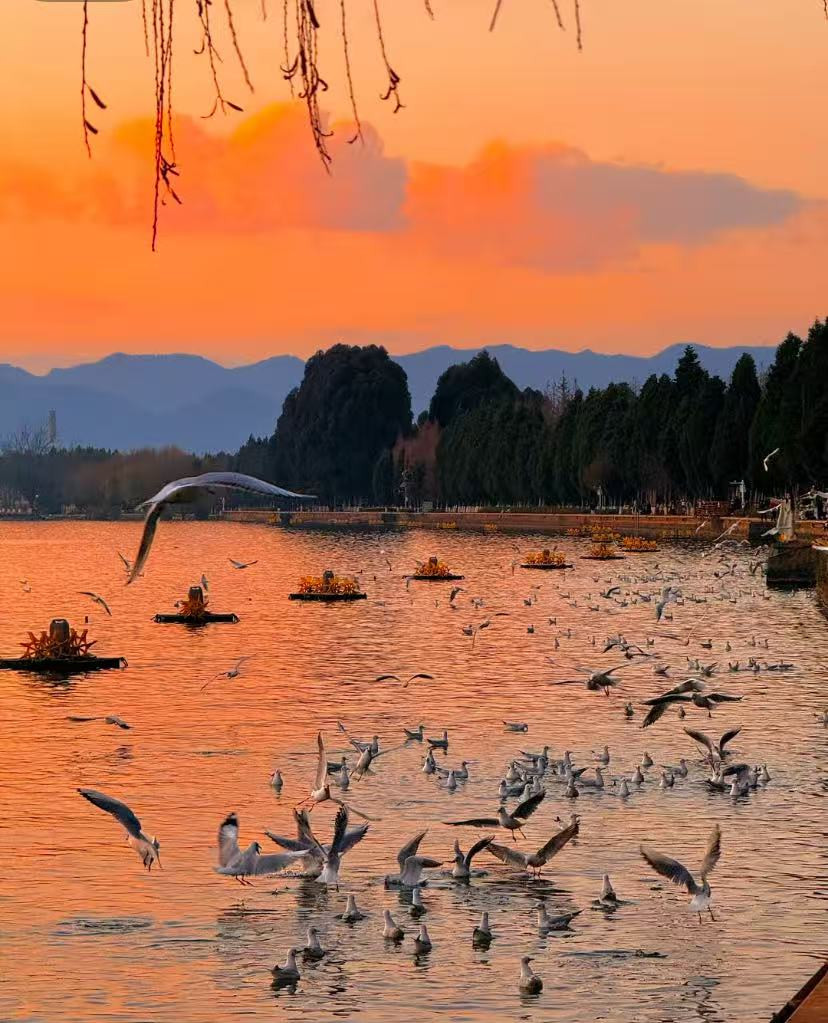 到了冬天,那限定的快乐可是海鸥给的呀🦭!带上一袋馒头,只要你轻轻一挥手,成群的海鸥就会马上飞过来,你可以抓拍它们飞行的瞬间,真的超级灵动呢!待到傍晚的时候,滇池的落日会把整个天空都染成橘粉色,海鸥们披着霞光归巢,那浪漫的氛围简直拉满了🌇!公园里面还有大片大片的草地,你可以在这里搭帐篷,要是带娃来的话,让孩子去摸鱼钓鱼,他们可以玩上整整一下午呢👨👩👧。