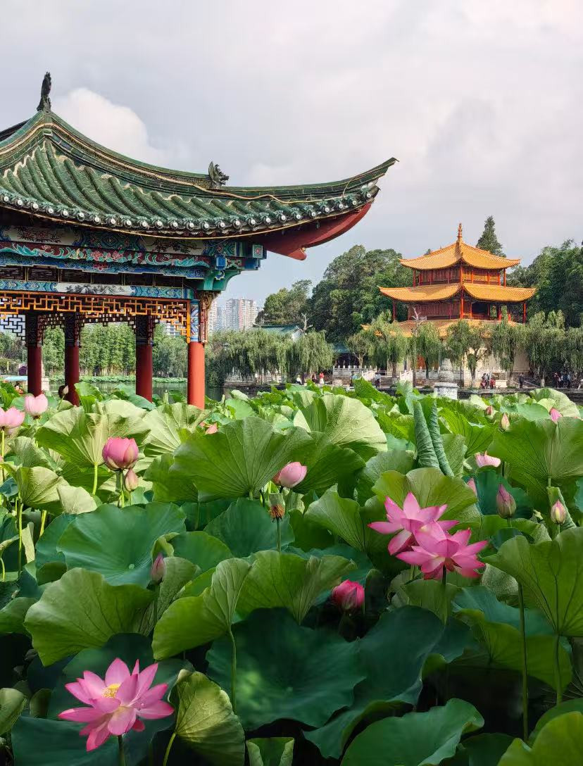 楼旁的近华浦是散步天堂,三面环水,柳枝垂到湖面,小桥连着凉亭🎋。夏天来正好,满池荷花怒放,绿荷叶衬粉花瓣,拍照根本不用滤镜📸。逛累了坐画舫游滇池,船在水里走,人就像泡在风景里,别提多惬意了🚢。
