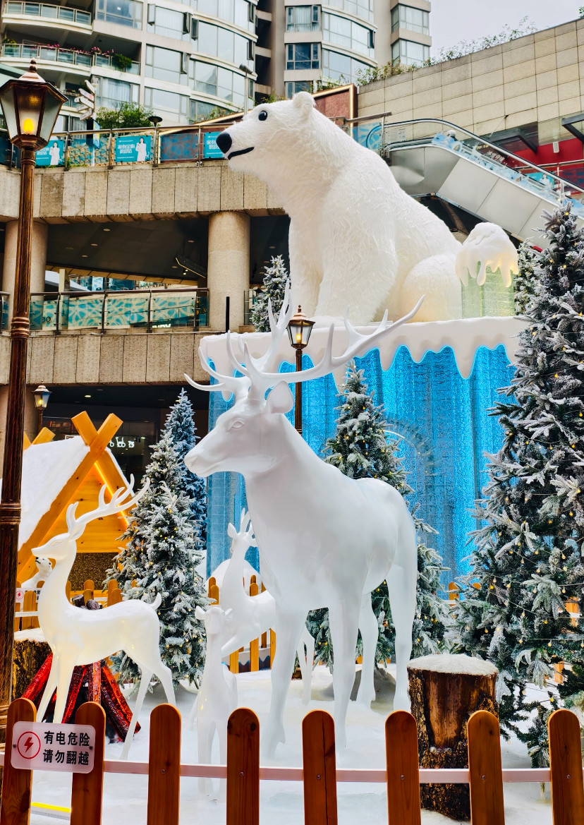 刚进顺城广场就被巨型北极熊雪屋装置拿捏!白色毛绒北极熊蹲在“冰蓝城堡”上,旁边的白鹿群+雾凇圣诞树,自带冬日滤镜✨ 站在围栏外仰拍,分分钟拍出北欧街头感📸(原相机直出都能封神谁懂啊!)