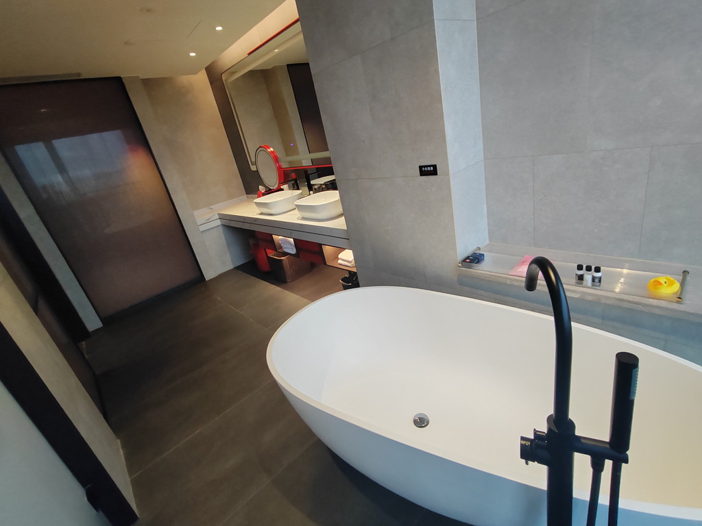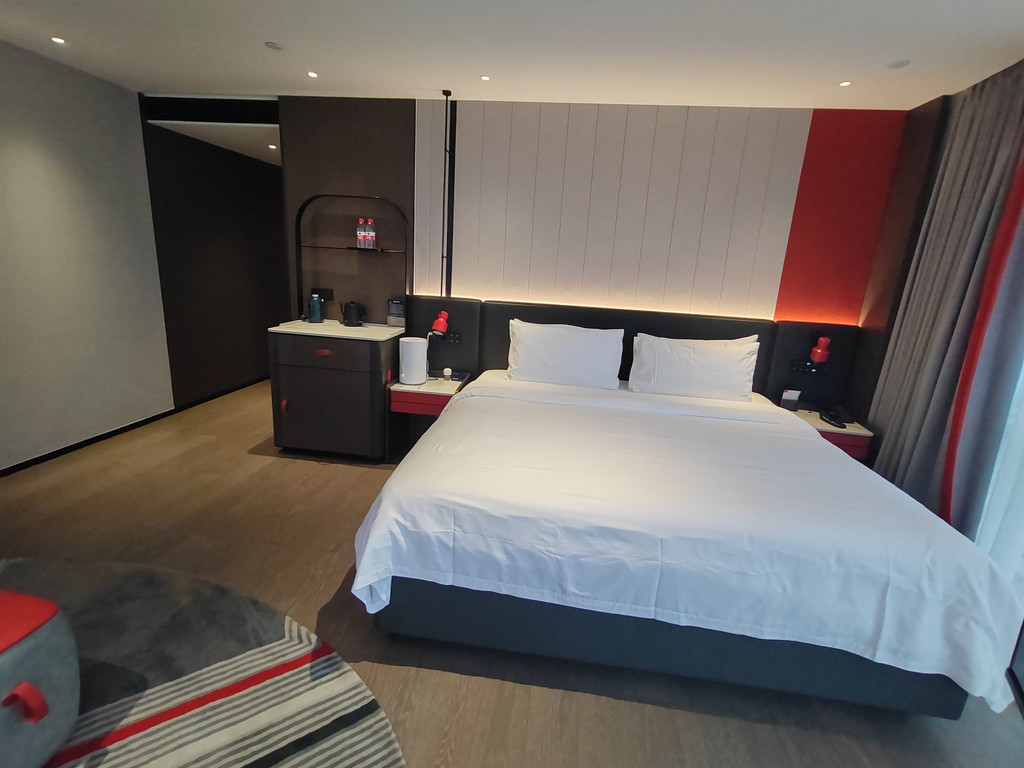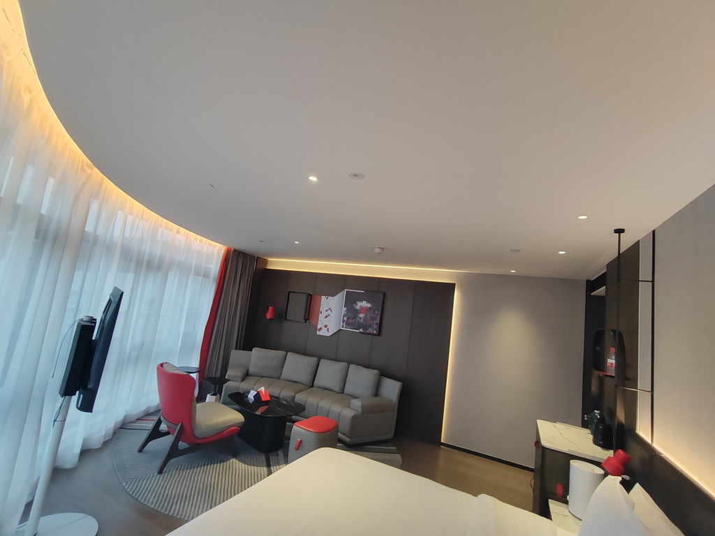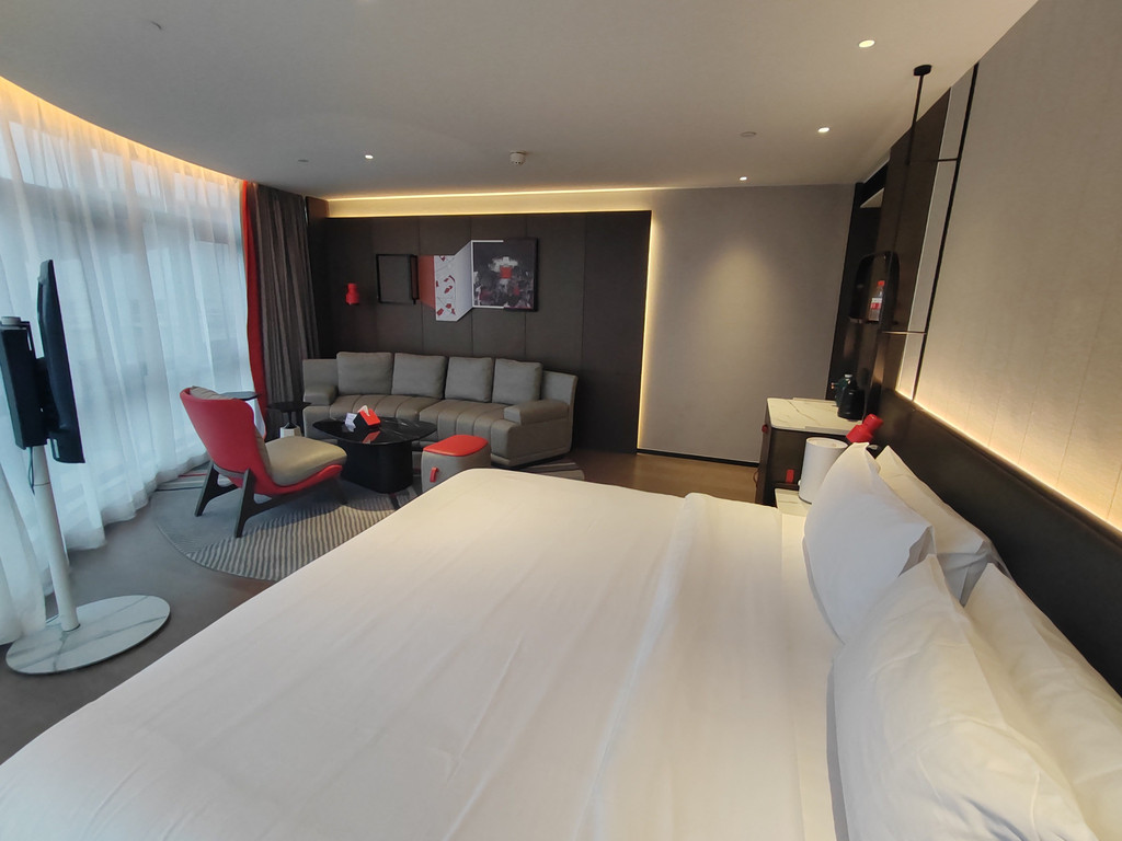 酒店设计极具格调,黑红撞色的现代风格,智能客房配备全景落地窗,让你在房间内便能欣赏城市美景。