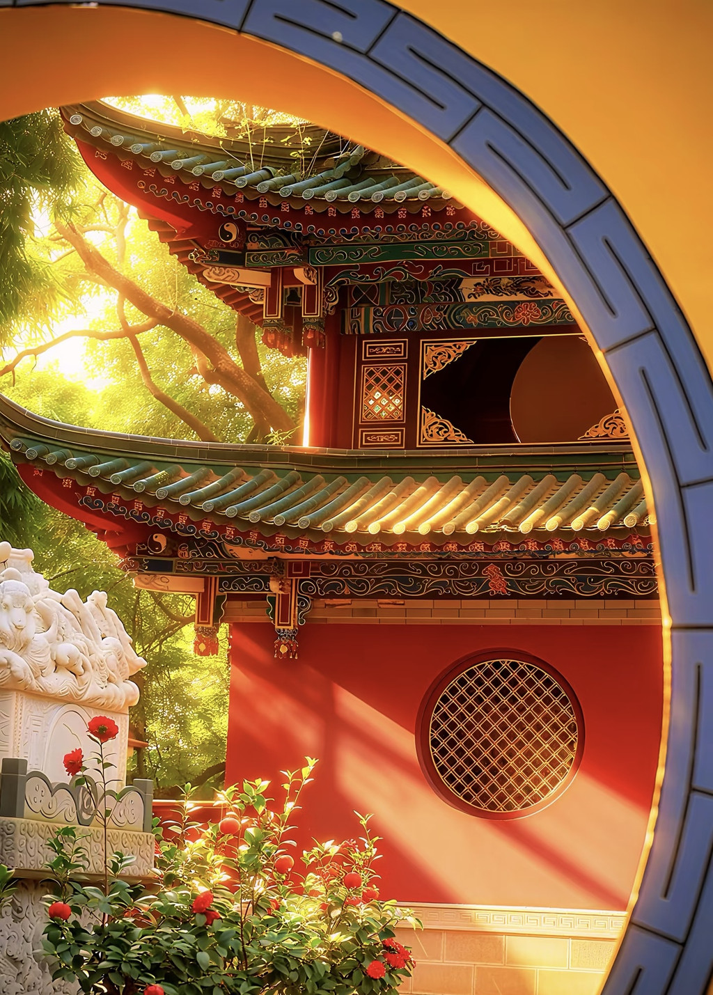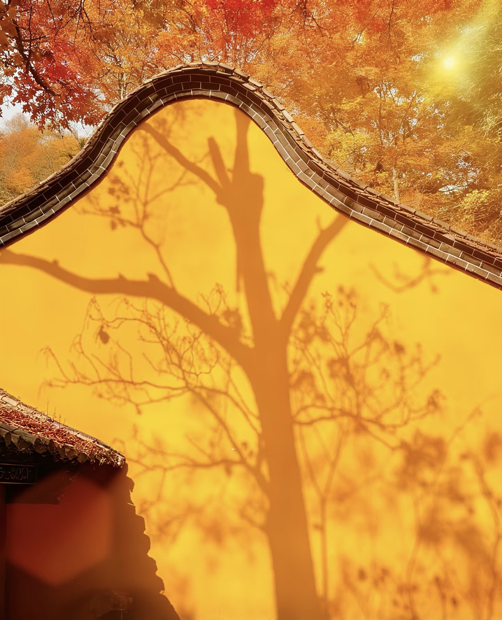 2. 月牙黄墙⏰:下午2点冲!树影刚好落在黄墙上,站侧方拍,秒变古画里的氛围感美人🥰