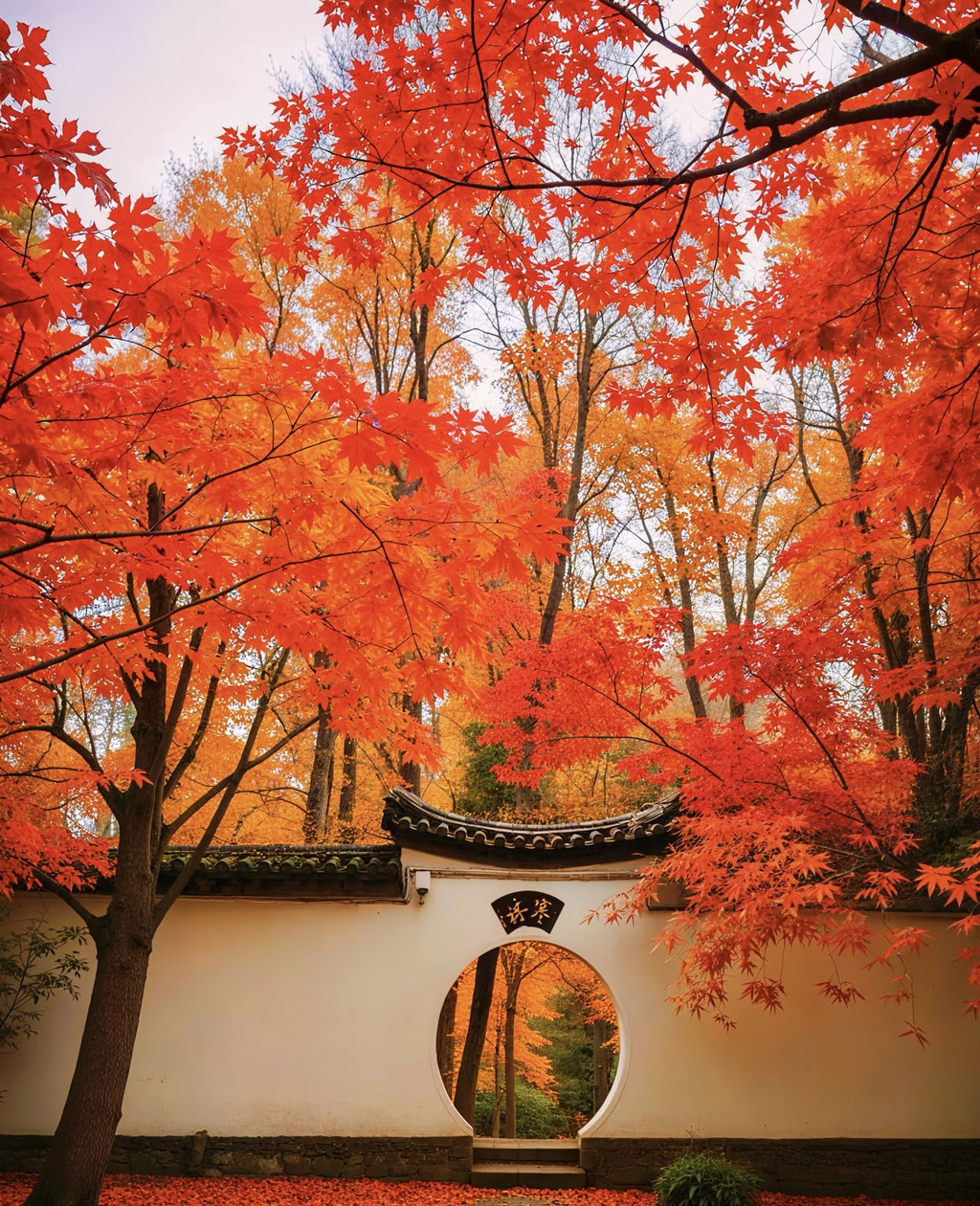 1. 红枫圆拱门📸:站门外把红枫+圆门框进画面,捡片落叶垫镜头前,“秋天装在画里”那味儿直接拿捏~