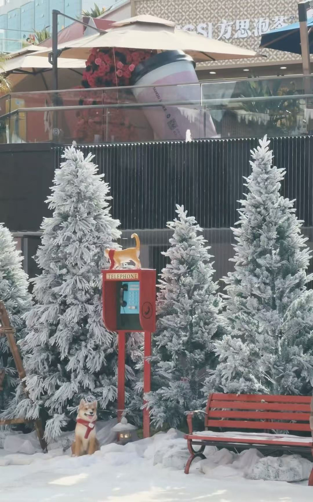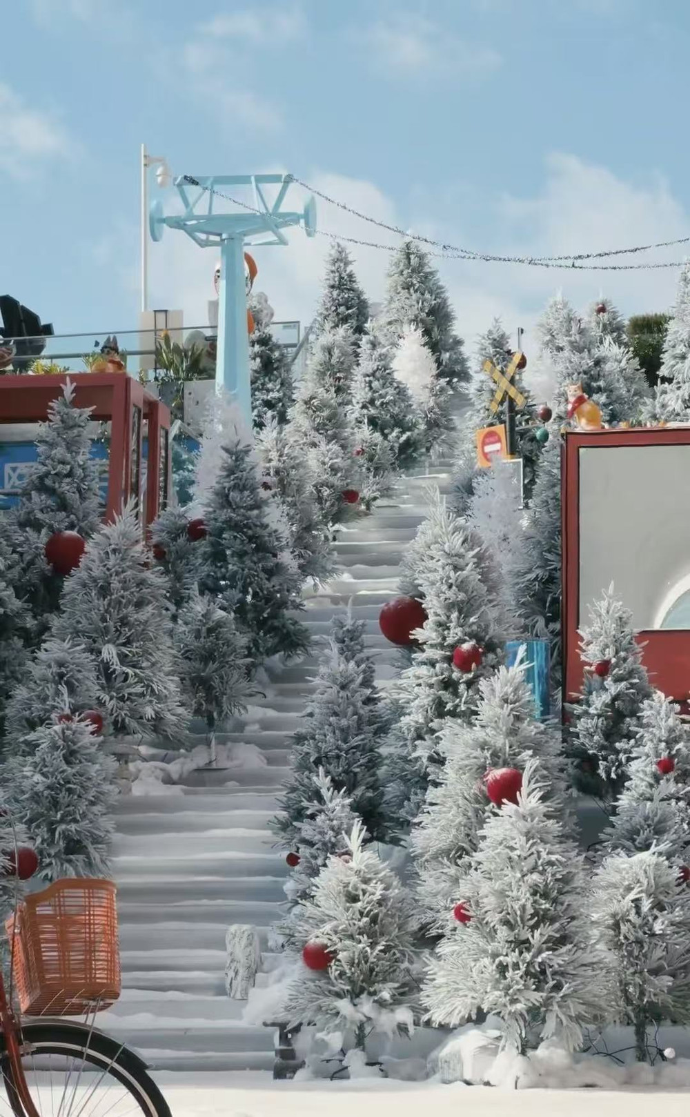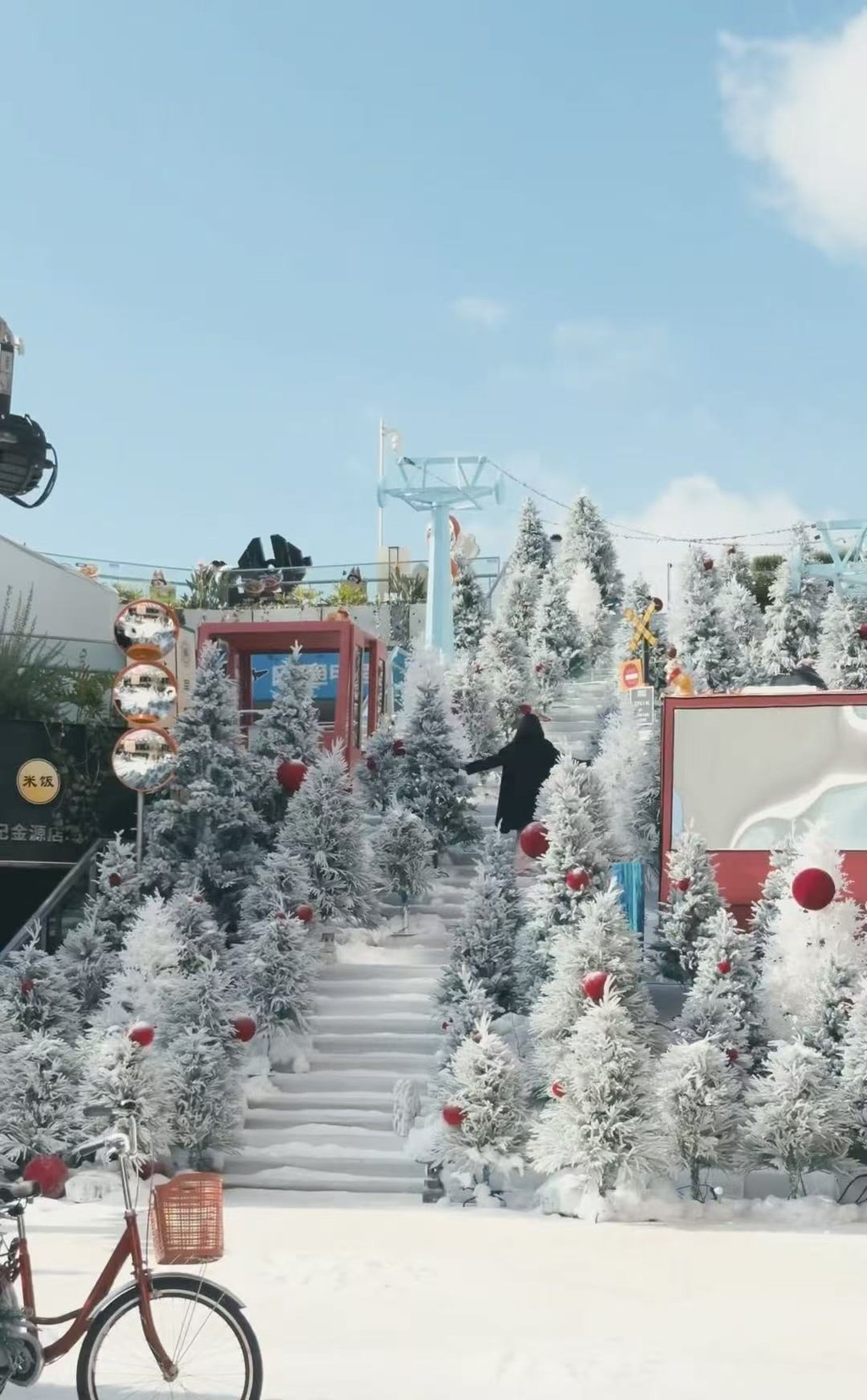 霜白圣诞树排满台阶,红绒球+复古单车+小电话亭,往那儿一站就是美式小镇女主既视感📸傍晚人造雪一吹、灯光亮起,连风里都是甜的~谁拍谁好看!