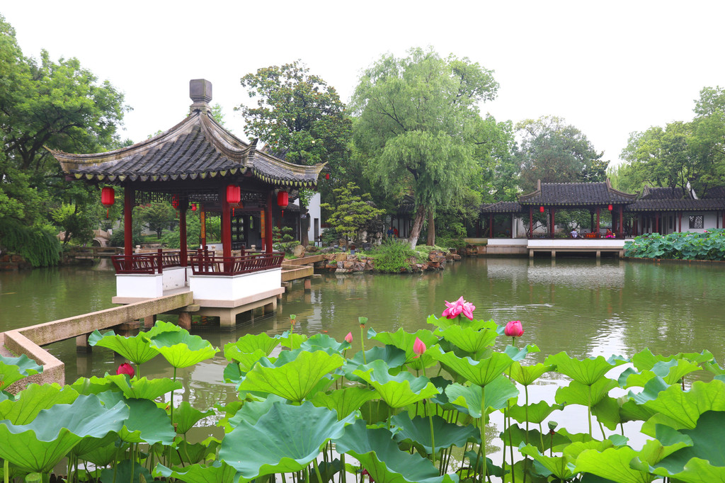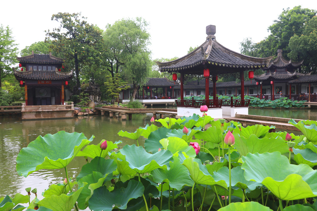 我们的目的地是离我们入住的酒店不远的 江南 小城 常熟 ,这是我最喜欢,也多次来过的地方, 常熟 好玩的地方太多了,这次我们选择了 常熟 曾赵园,这是一座 江南 古典小园林,素有“春访牡丹夏观荷”之趣,走进古色古香,典雅别致,不是特别大的曾赵园,但亭台楼榭、雕栏画栋,身处闹市之中,却可以做到闹中取静。宛如天工的造园艺术特色,优雅别致的园林意境, 江南 古韵,婉约可人,园内古木葱茏,步移景异,满园似画。微风细雨下,摧着满池的荷花绽放,惹的赏荷人纷纷踏至前来。在荷叶的衬托,微风的扶持下,翩翩起舞的荷花仙子,有的花苞初绽,像在启唇说话,有的含苞待放,犹如羞涩的姑娘低头不语,有的舒展怒放,仿佛在畅怀大笑,清风徐来,荷香扑鼻,令人感到神清气爽。我们最先步入的是曾园,雪白的、粉红的、绯红的……各色荷花次第绽放,放眼望去,层层叠叠的荷叶大 大方 方地舒展开来,簇拥着一朵朵娇嫩的“荷花仙子”,亭亭而立、花姿绰灼。白墙黛瓦、亭台楼榭与这一池荷塘相映成趣,为荷花增添了更多婉约灵动的气质。