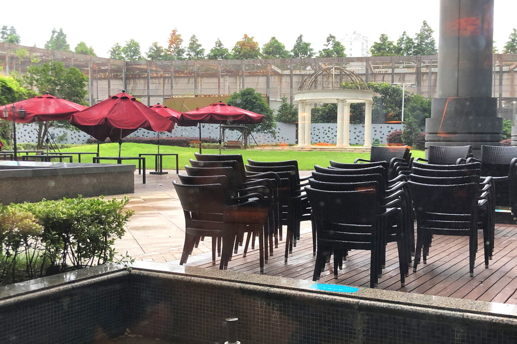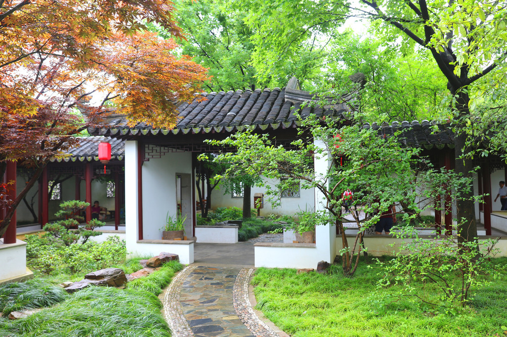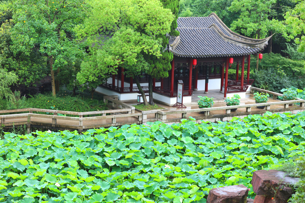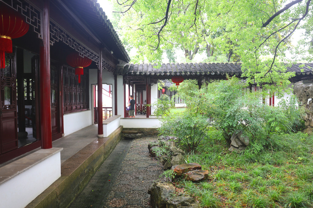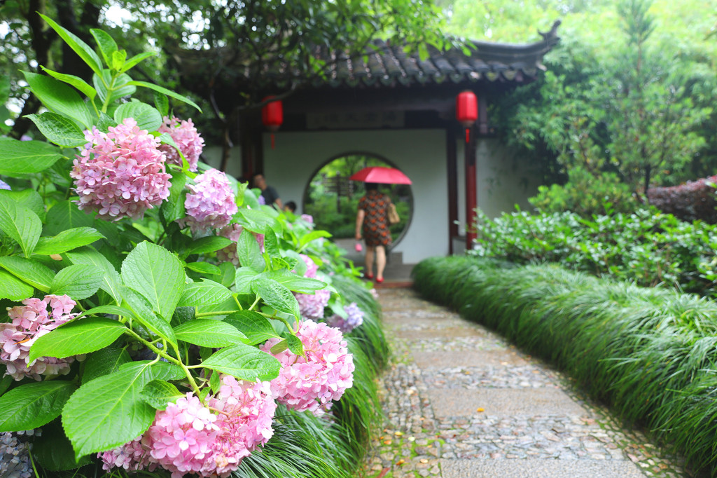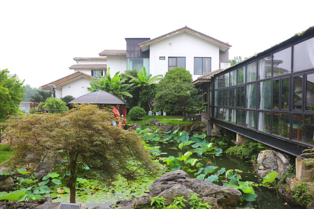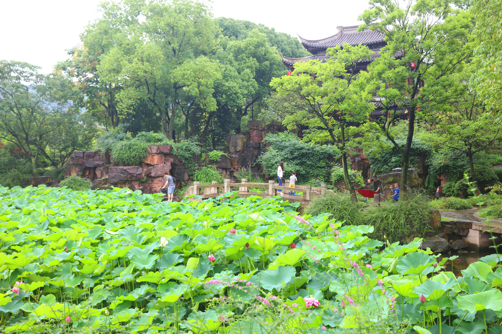 早晨窗外下起了哗哗的阵雨,来到酒店的餐厅,吃着品种丰富的自助早餐,听着雨声、看着餐厅外酒店庭院的满目翠绿、开启了新的一天,窗外的雨时停时下,此时正是有人喜欢、有人厌的 江南 梅雨季节,身在江南 ,那一定要懂得梅雨的缠绵悱恻,也钟爱水墨诗意般的烟雨 江南 。吃过早餐我们决定早早退房,再去那风蒲猎猎小池塘,去雨荷花满院香的烟雨 江南 间。
