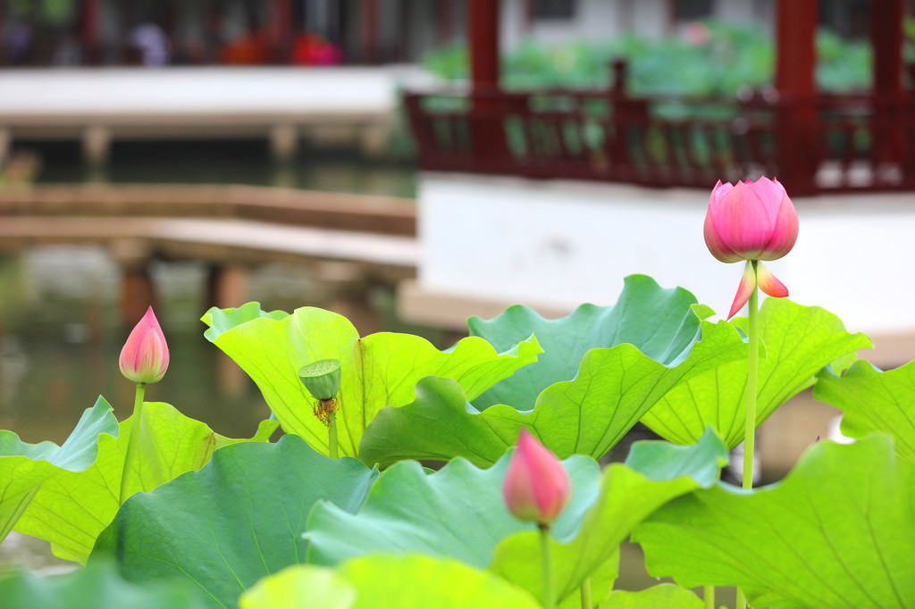 我们继续沿着园内绿道漫步,感受一路的绿意盎然,享受夏日避暑消夏的乐趣。来到赵园,这里满池荷花玉蕾吐艳,嫩绿的荷叶间点缀着浅色的花苞,如出浴仙子,清新得惹人喜爱,微风吹过,荷花轻轻摇曳,似落入人间的仙女,翩翩起舞,一股清香便迎面扑来,沁人心脾,无论是含苞时的娇羞,初绽时的稚嫩,还是怒放时的舒展,每一款都充满了韵致雅趣,而远处虞山山巅的辛峰亭、城楼与园内水榭长廊遥相对应、相映生辉,倾刻间勾勒出一幅幅秀丽的水墨画卷,