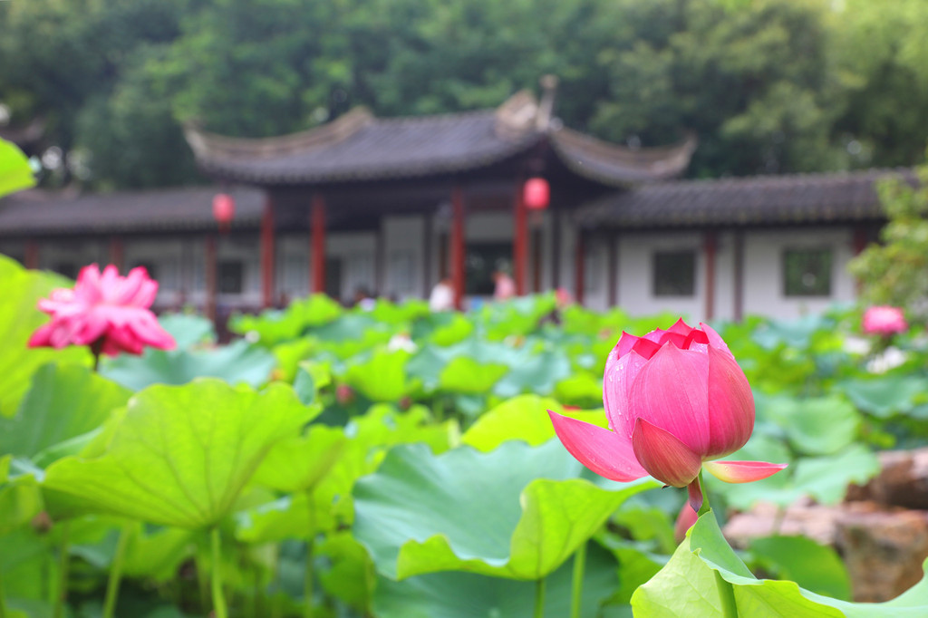 在赵园内曲折的长廊缓缓走过,荷花朵朵穿梭在片片青绿荷叶间,霎时间,让平日单调的池塘变得多彩万分,荷花、游客、...构成了一幅美丽的风景画,随手一拍都是一部清新大片!最后登上曾园内能俯瞰全园风光的清风明月阁,欣赏池塘碧水,叶碧无穷,花影重叠。尽管我不太喜欢炎热的夏天,但它依然是四季更替中不可抹去的一轮,然而当繁花谢过,有一种花却不畏酷暑,在万绿丛中绽露笑颜,静静开放,不张扬,不炫耀,一种自然天成、出淤泥而不染的冰清玉洁,用生命开出如诗的瑰丽,这就是大家为什么喜欢荷花的原因了。