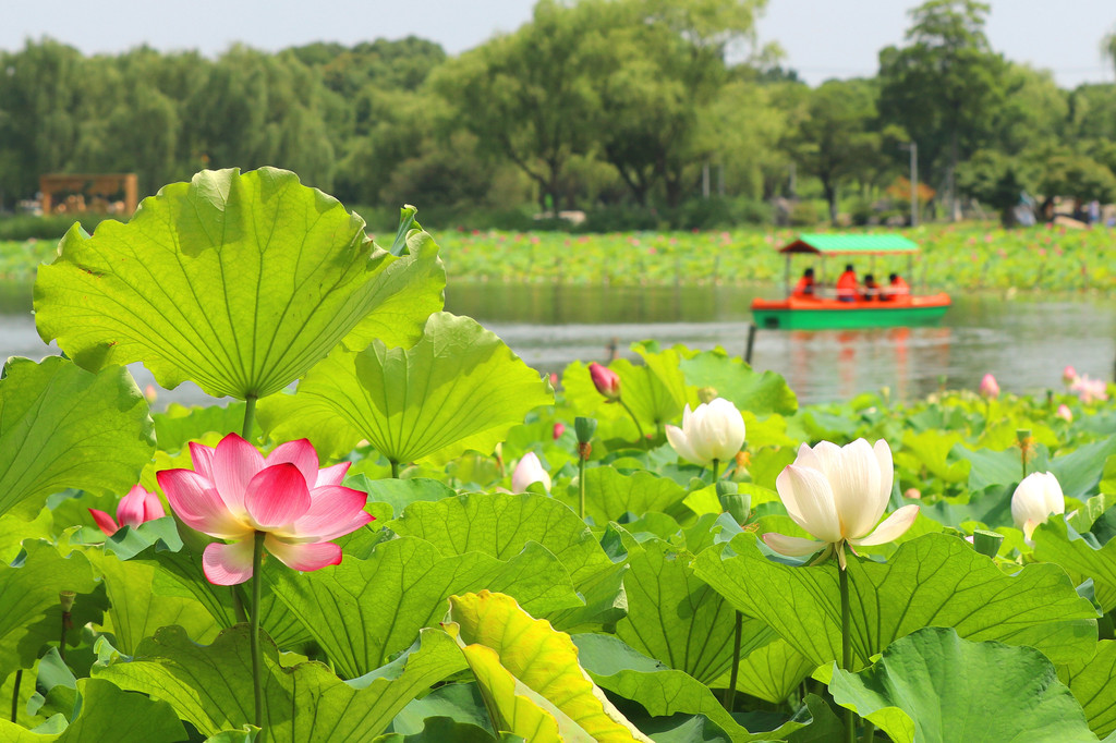 半个多小时后我们来到了属 苏州 工业园区阳澄湖国际休闲度假区——阳澄湖半岛上最大的生态公园莲池湖公园。走进园内,成片成片的荷花绽放,在池塘中随风摇曳、亭亭玉立,伴随着清新淡雅的幽香,我们沿着水边小路深入荷花丛中,与姿态万千的荷花亲密接触,体验“莲叶何田田”的美妙意境。