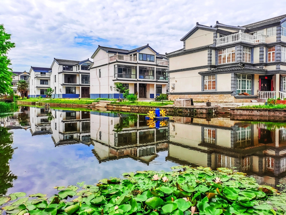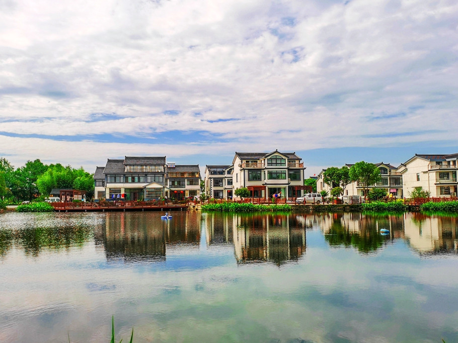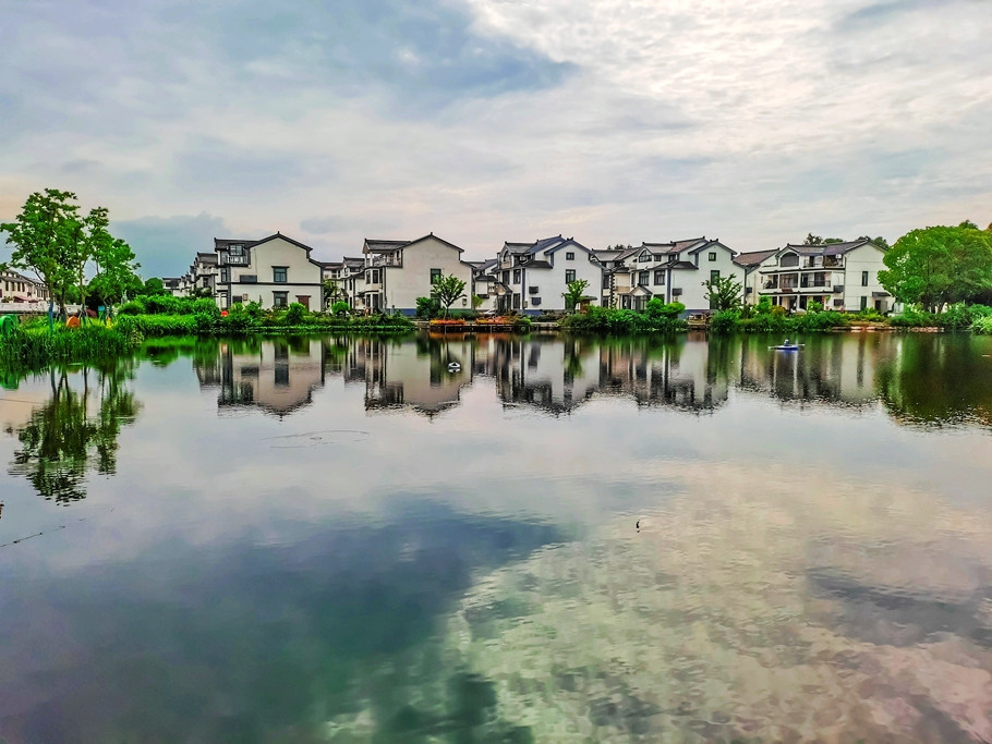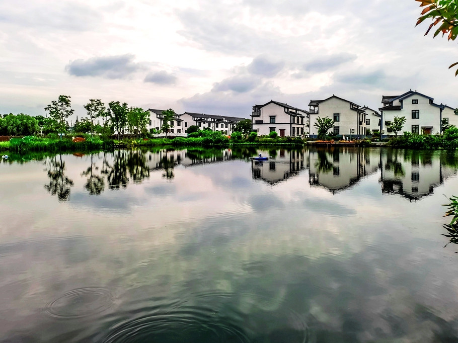 六如墩村前的池塘,水质清澈,池塘边上,粉墙黛瓦掩映的村落就在眼前了,一排排明亮的别墅楼井然有序。