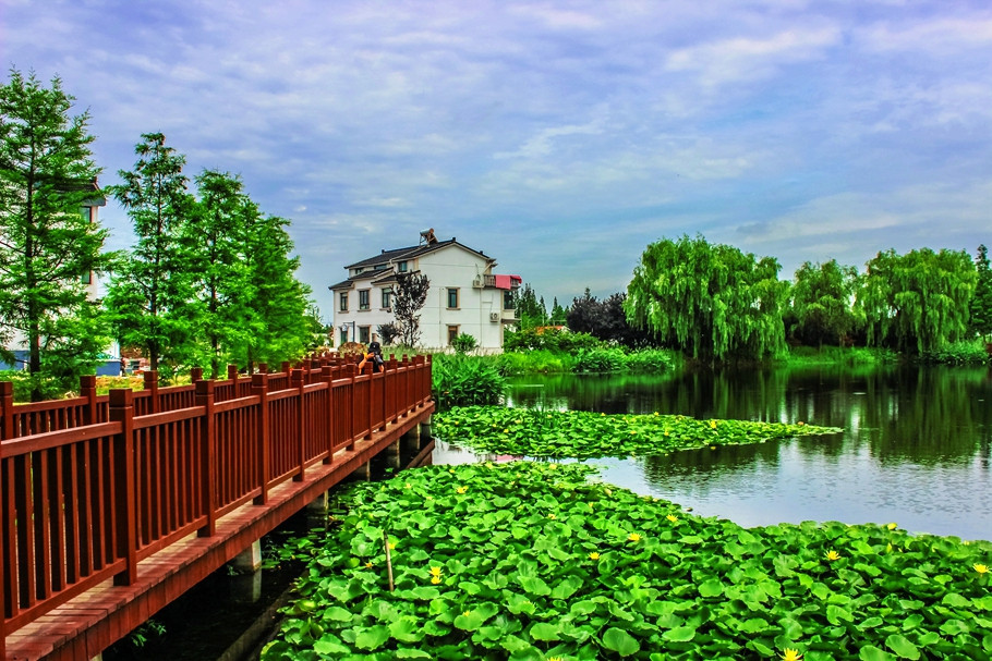 沿着乡村小道进入六如墩村,第一眼就能看到很大的河面,河的两旁都是农民的住宅,河边铺成的木栈干净而整洁,很有几分古村落的味道。