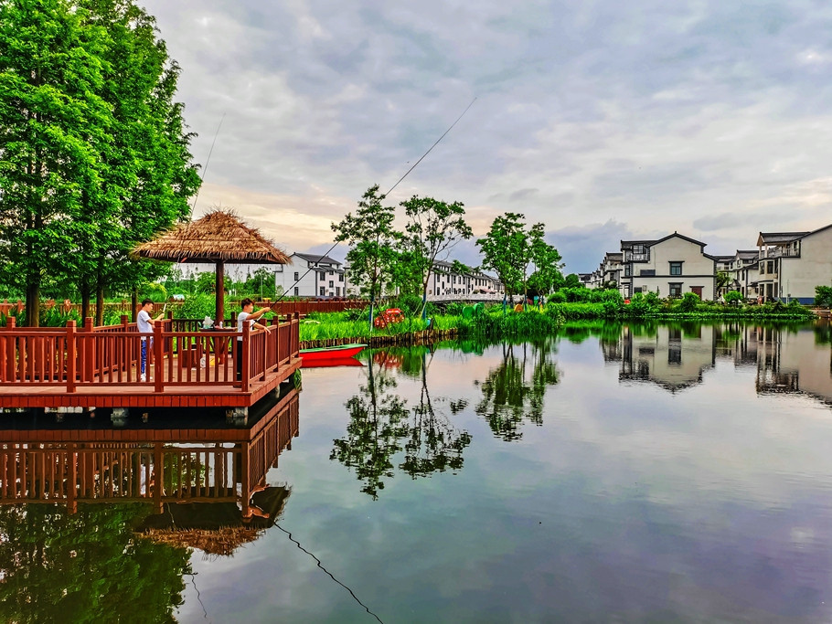 河边极具水乡韵味的沿河木栈道、茅草亭、钓鱼台,让这座古朴的村庄更迷人。