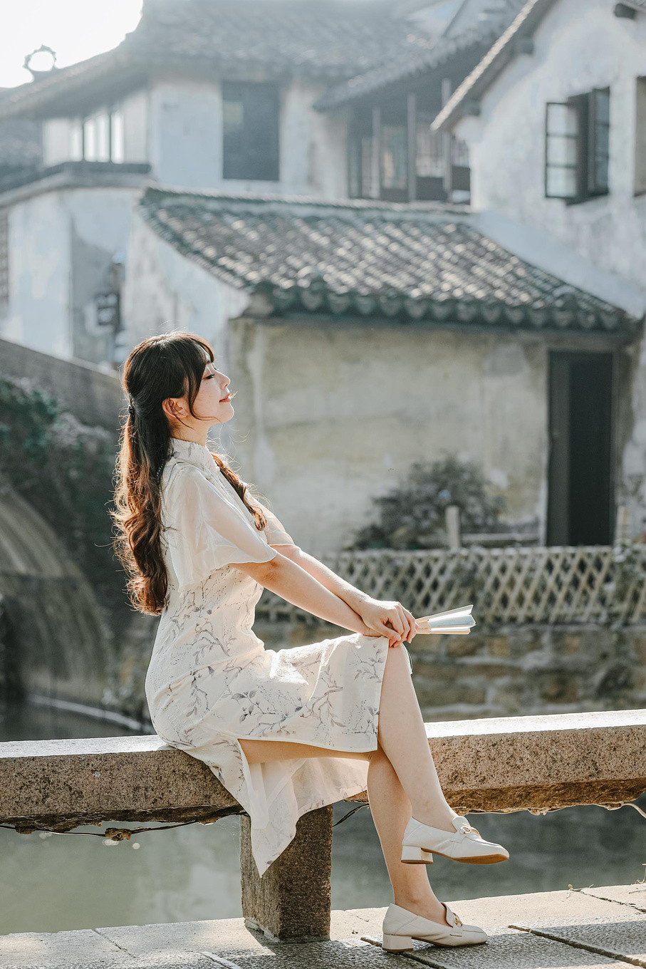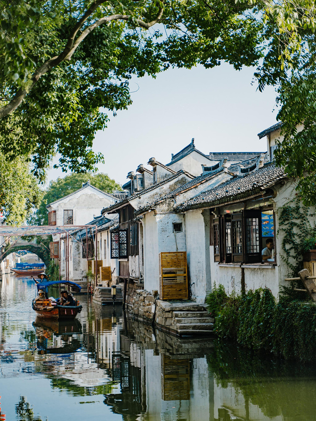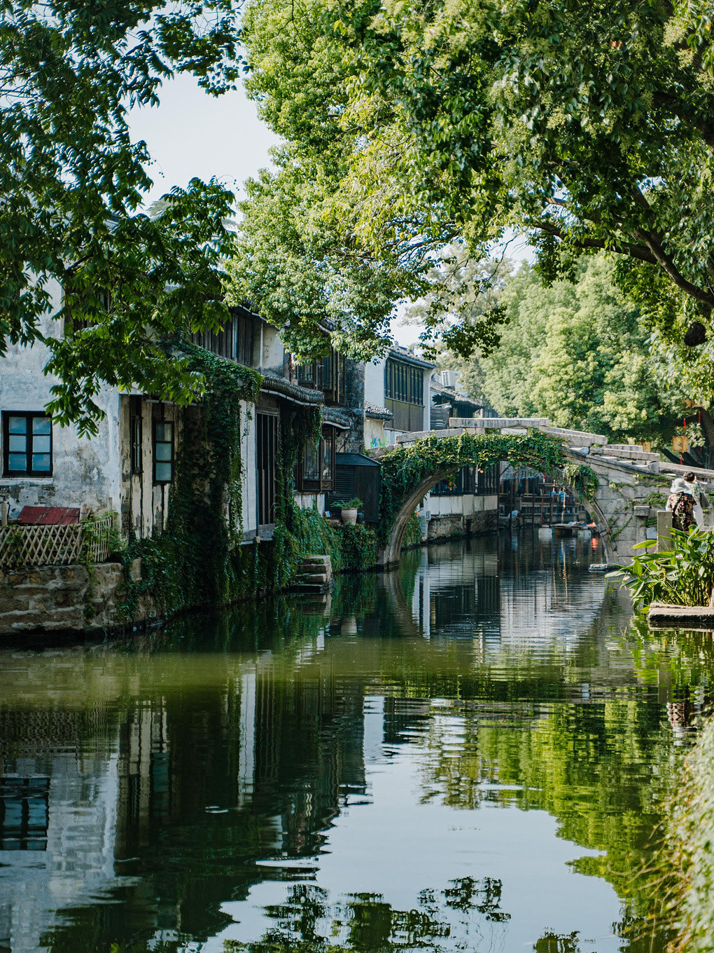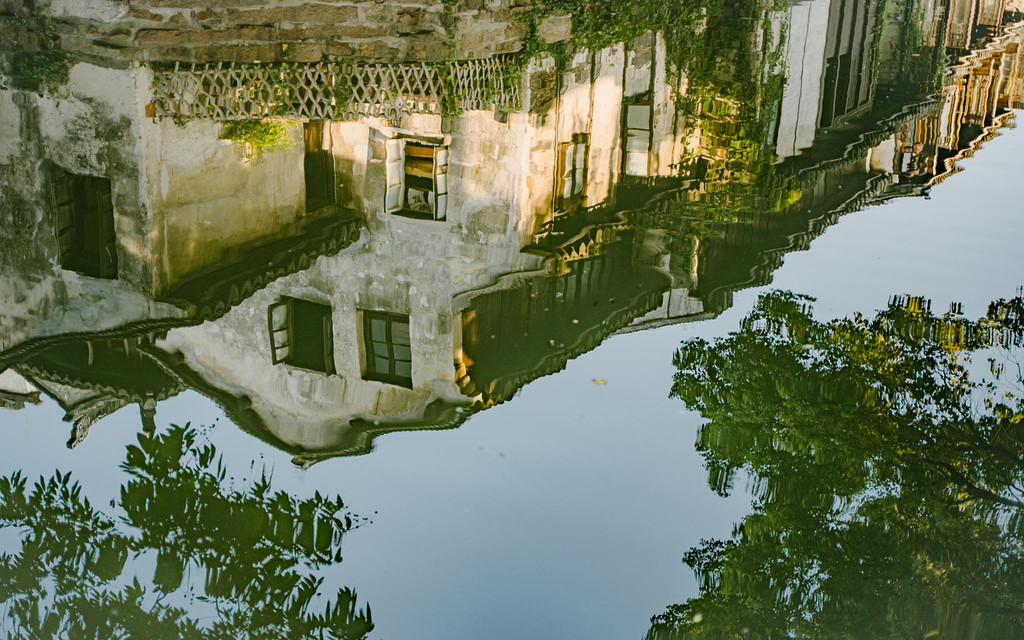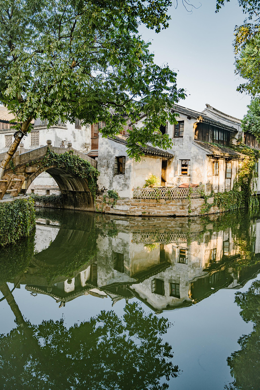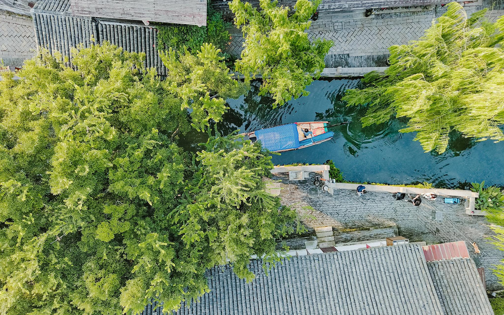 仔细瞧着,临河的老房子错落有致,一色的粉墙黛瓦在绿树掩映中,与双桥一起轮廓分明地倒映在水里,构成了一幅精妙的水乡风景画。