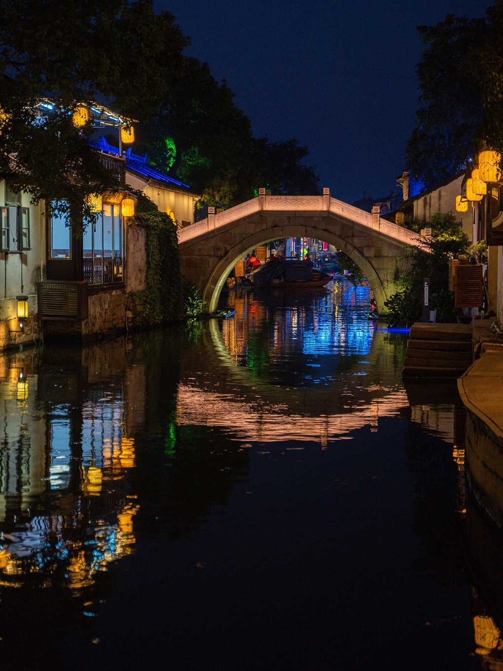 隐匿在夜色中的古镇,倒映在水中的石桥、楼屋、树影,都被这木橹搅碎,变成斑斓的光点,缕缕涟漪,一不留神就荡漾进了心里。