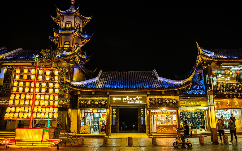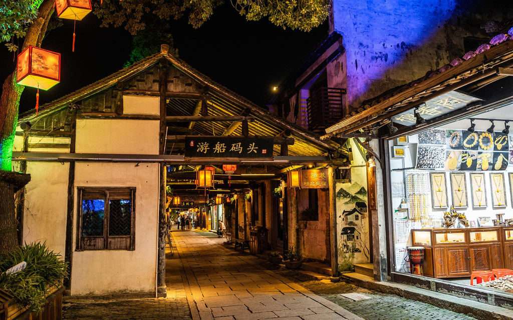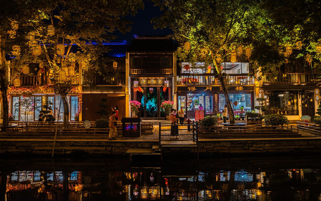 荡着波光的小河,有质感的石板路,和热闹的人群,古老的徽派建筑在灯光的衬托下,显得韵味深长,闪烁的灯光和廊棚、屋檐倒映在水乡里,时光浅浅,温馨又静谧。