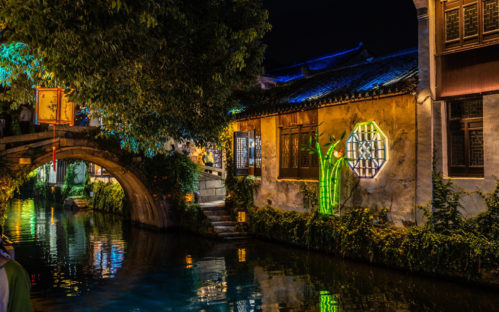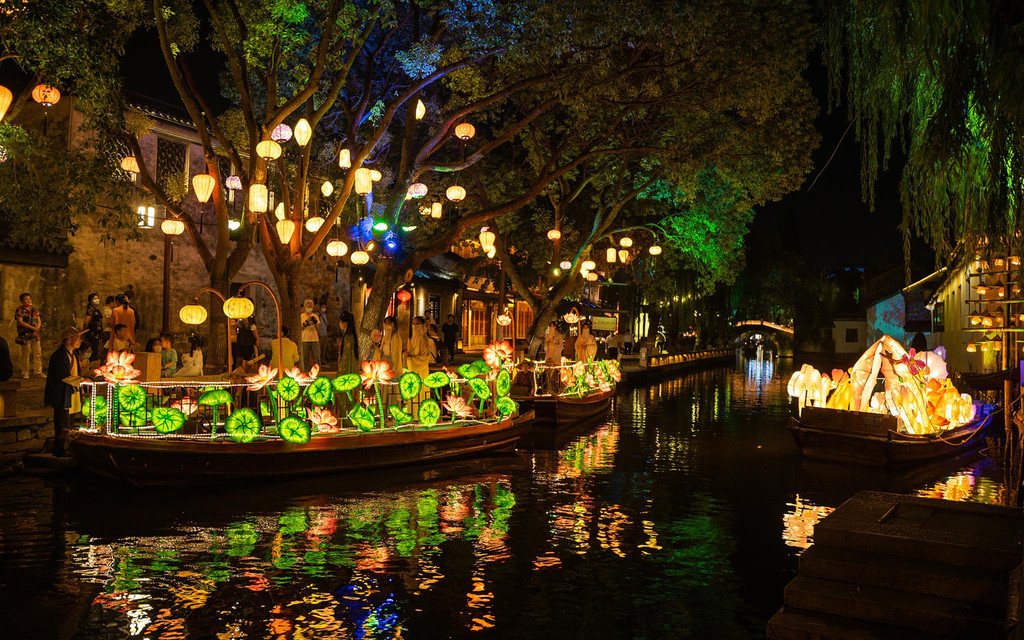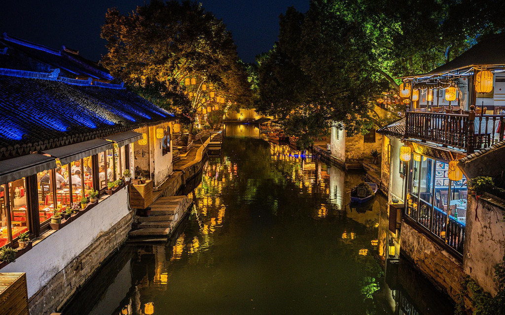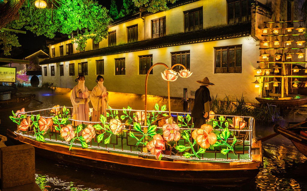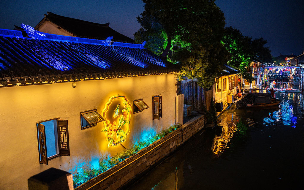 夜晚的周庄在灯光的映衬下显得更具风韵,绚烂的灯光下江南小调在夜色中响起,两岸的花灯鳞次栉比,与粉墙黛瓦、水巷小桥、老街古宅融为一体,也融化在质朴的水乡生活中。