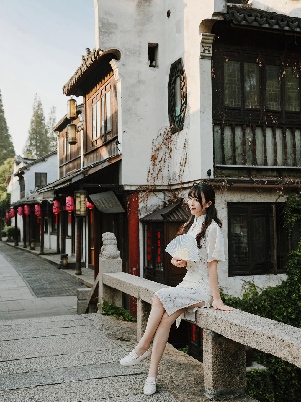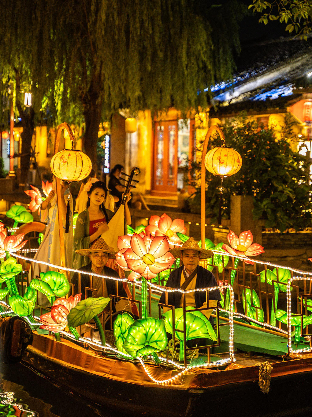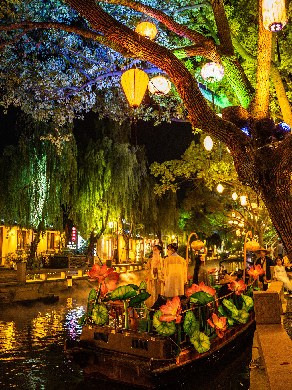 漫步在石板路上,欣赏水乡夜景和漫天花灯的同时,当然也别错过国风佳人的游船哦!