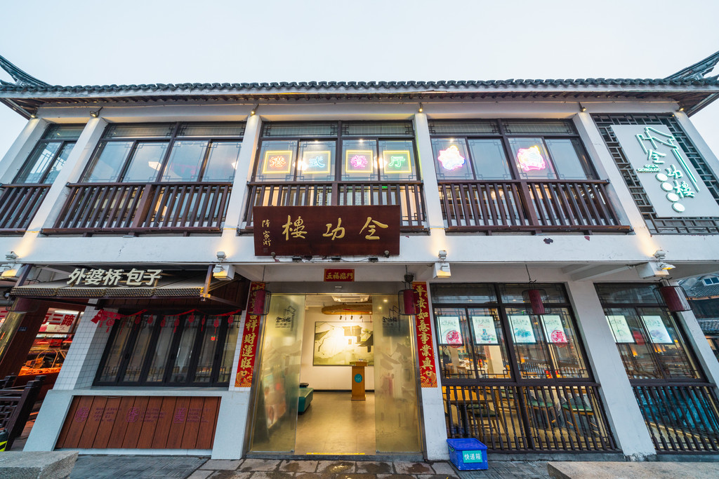 夜晚中的全功楼,从外部看,呈现晶莹剔透之美,而其美食也堪称周庄一绝,就餐环境素雅清新,餐食也是精美好吃。元宝万三蹄配卤蛋,既有猪蹄的香,卤蛋吸收了猪肉的浓汁,味道超赞。松鼠桂鱼酸酸甜甜很合女孩子的胃口。最可爱的是当属点心:钱兔似锦小白兔椰汁糕,萌萌哒让人不忍下口吃。最喜欢的一道菜是花开富贵,将蒸熟的南瓜摆放成似一朵胜开花的模样。
