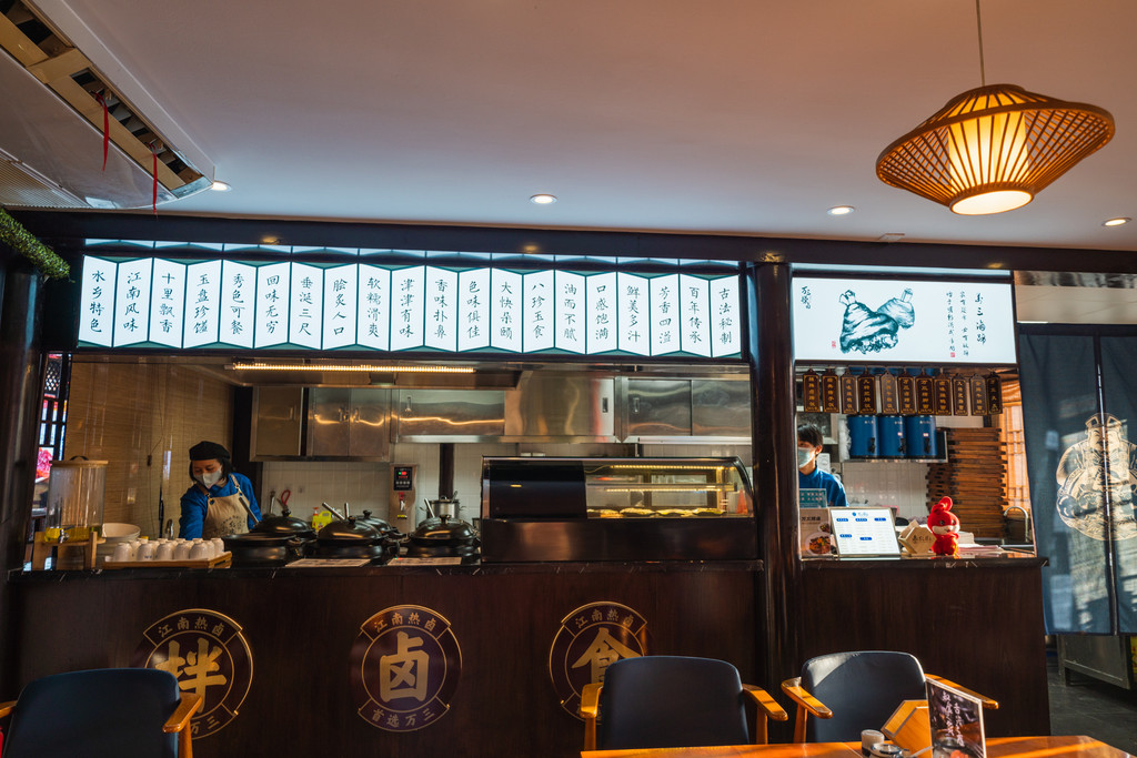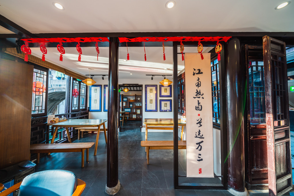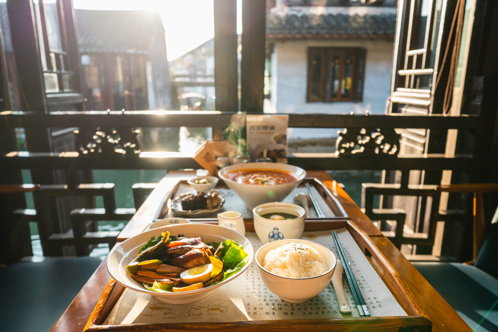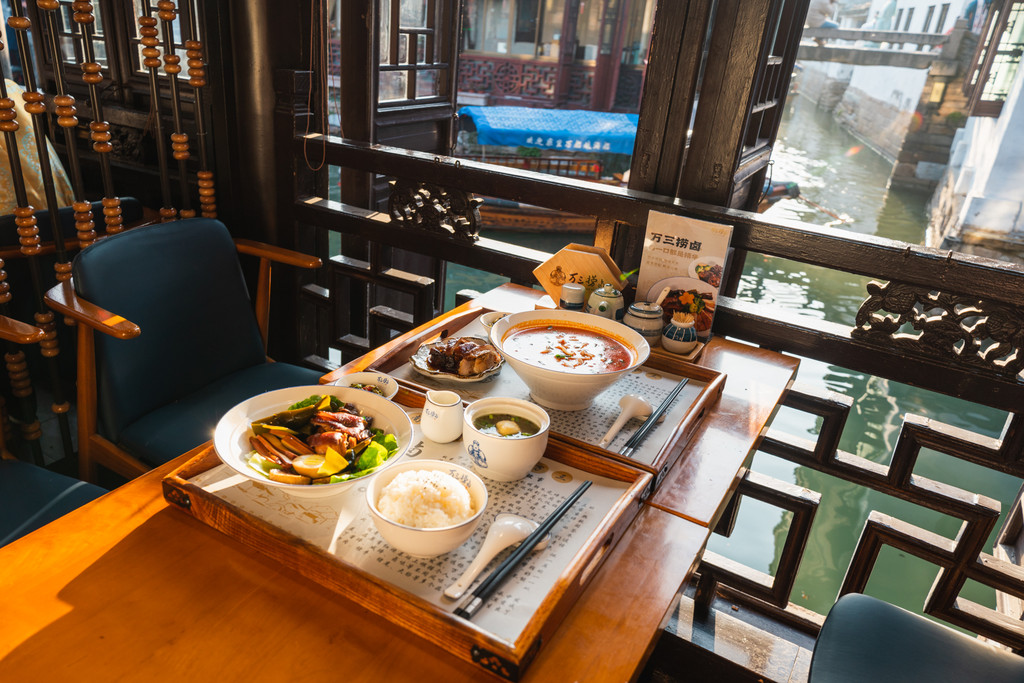 餐厅内雅致洁净,明厨亮灶,,又有江南小镇的厚重,依窗而坐,偶有船支划过,美成一幅画。