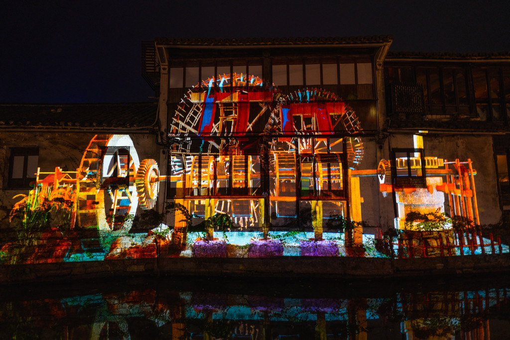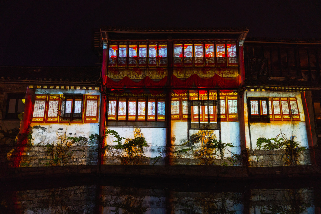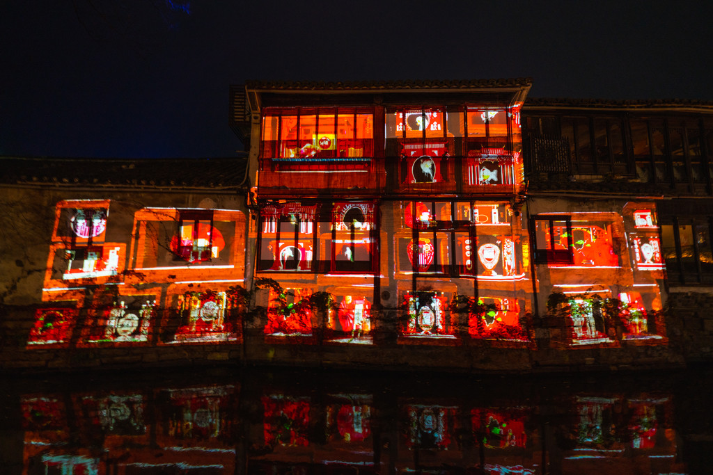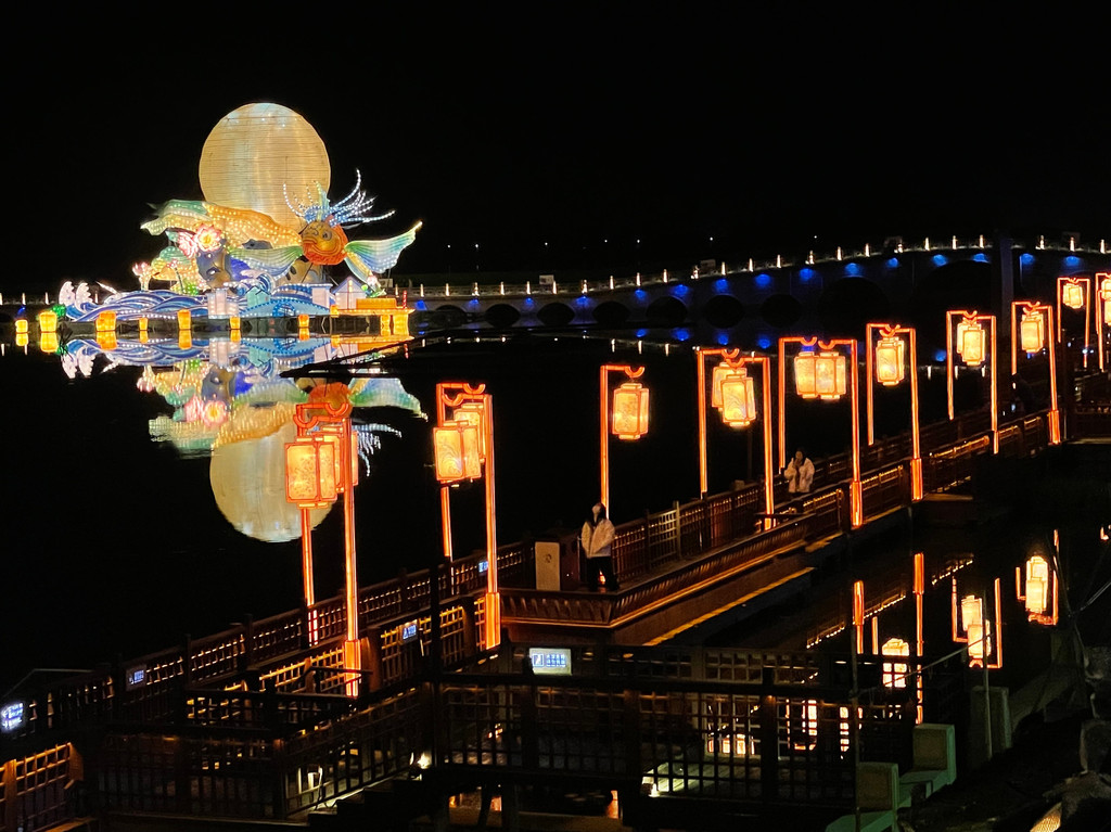 南湖湾光影是辉煌的,是周庄夜晚最亮的那一处,点燃着新年的祈愿,彰显着新春的快乐与喜庆,映于水面湖间,是光影交错之美。