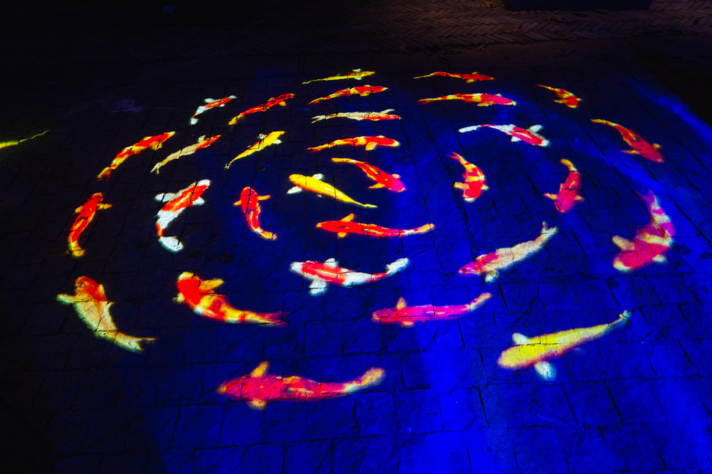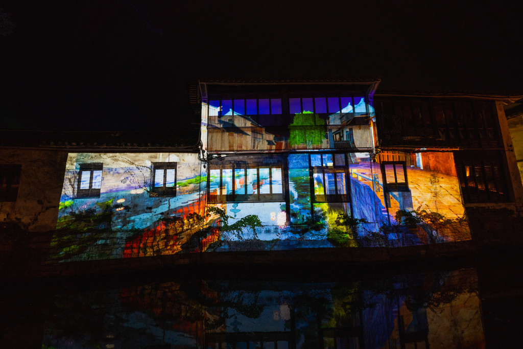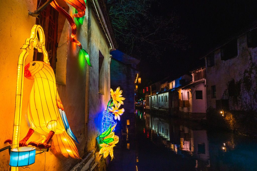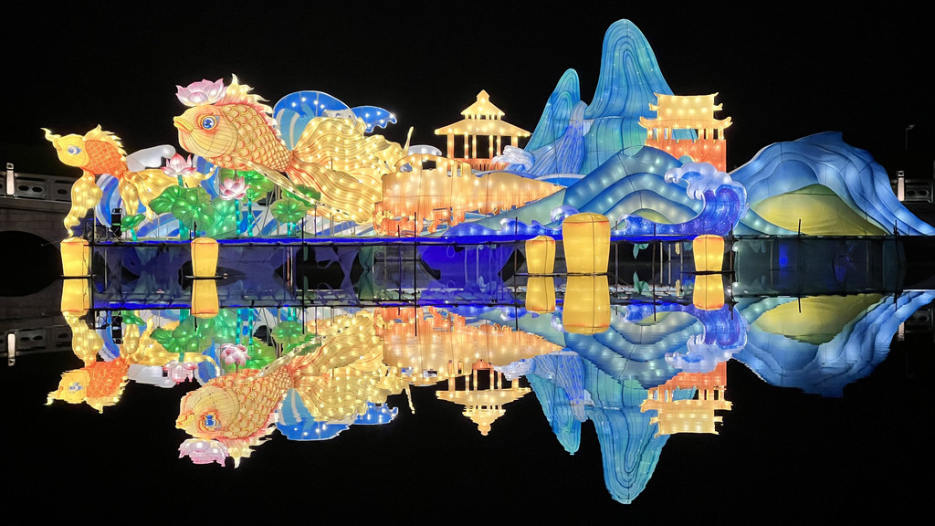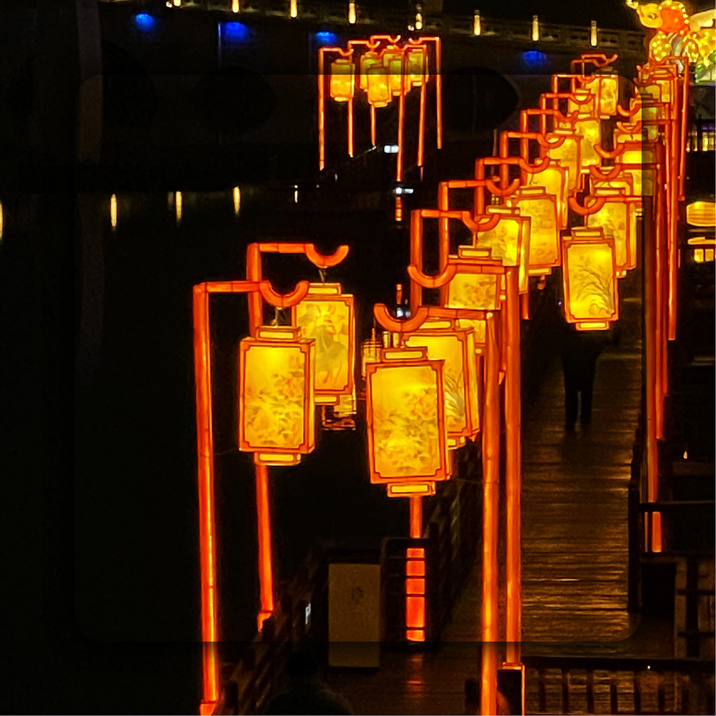 南湖湾光影是辉煌的,是周庄夜晚最亮的那一处,点燃着新年的祈愿,彰显着新春的快乐与喜庆,映于水面湖间,是光影交错之美。