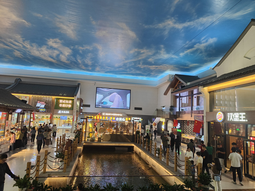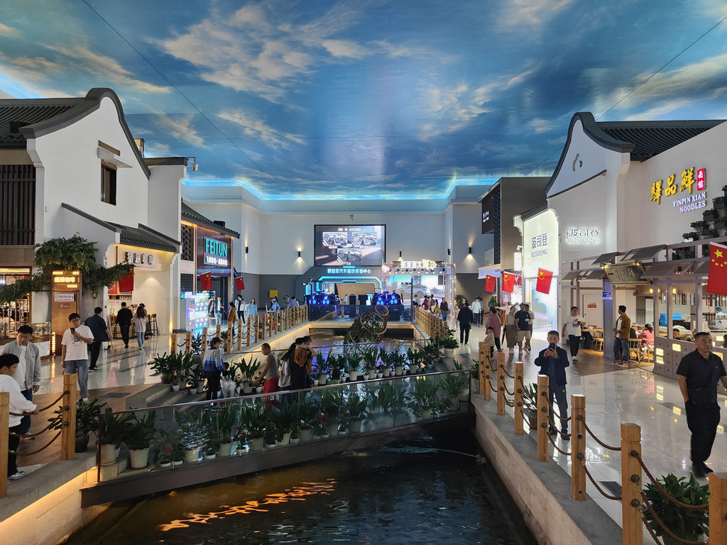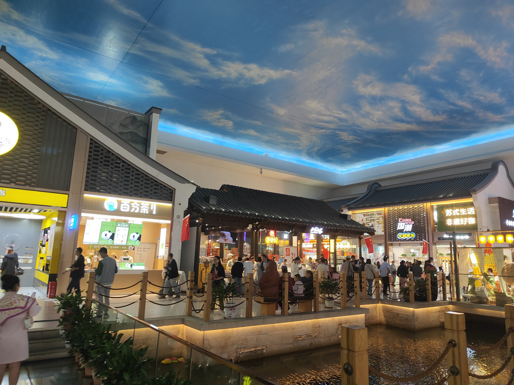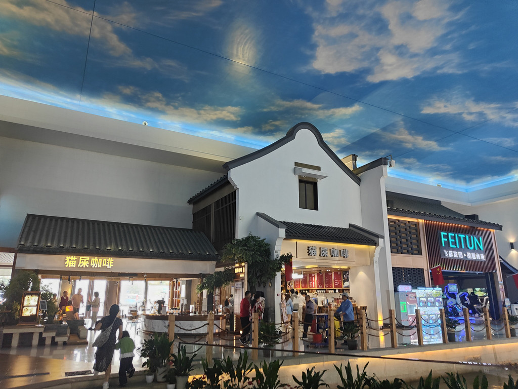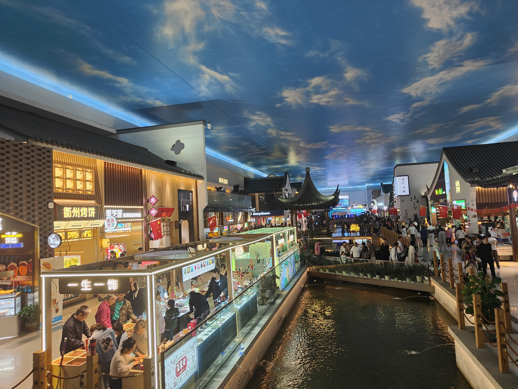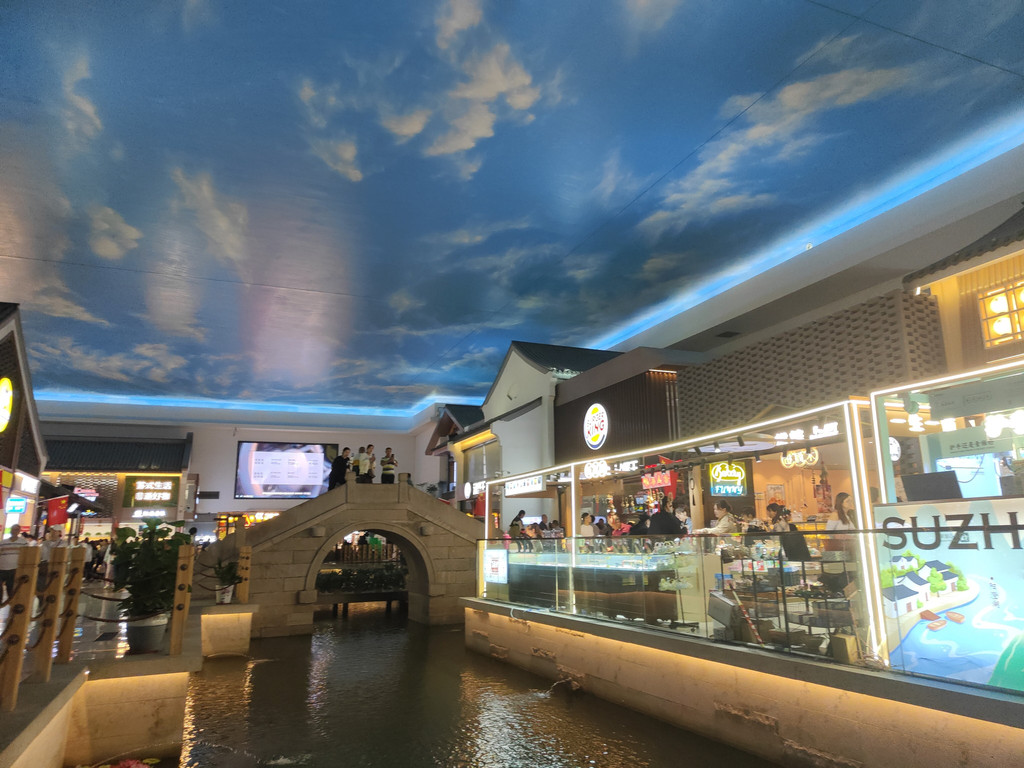 河上架着几座拱桥,两侧店铺林立,还设了仿古的六角小亭,真是把江南水乡的“枕河人家”重现在了服务区。天花板是蓝天白云,倒映在水里,一时几疑如真似幻,不知身在何处。