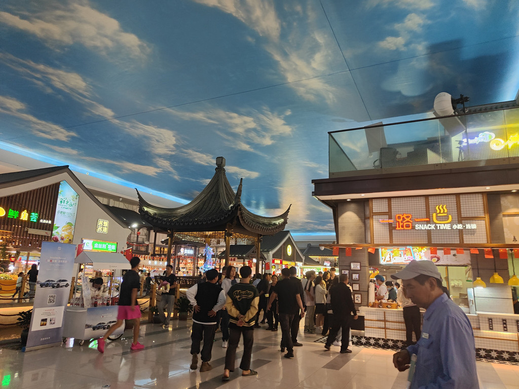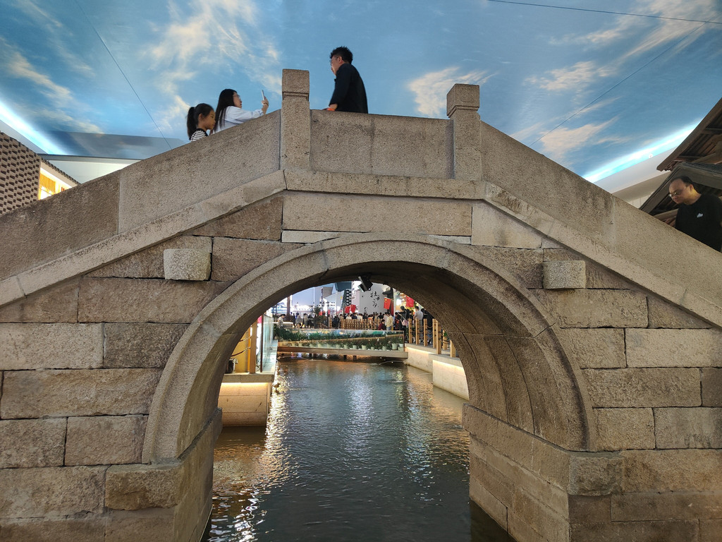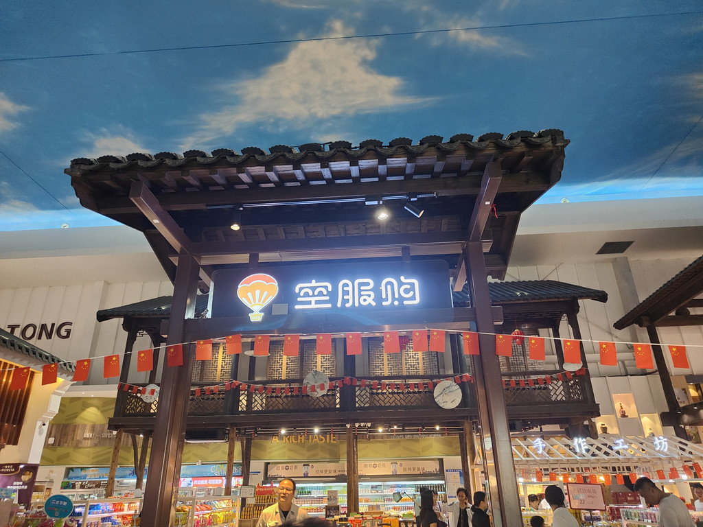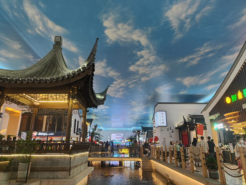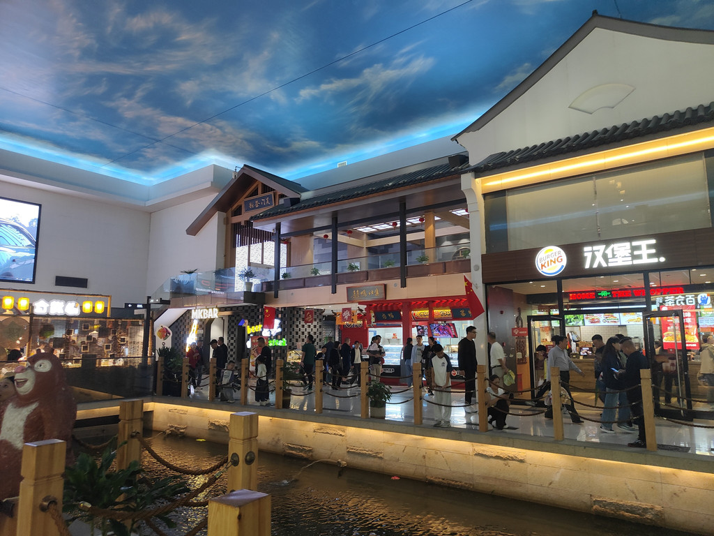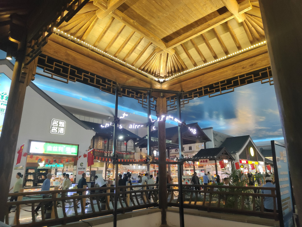 河上架着几座拱桥,两侧店铺林立,还设了仿古的六角小亭,真是把江南水乡的“枕河人家”重现在了服务区。天花板是蓝天白云,倒映在水里,一时几疑如真似幻,不知身在何处。