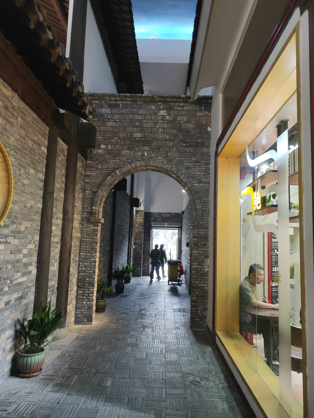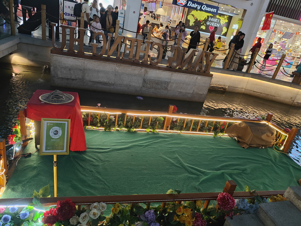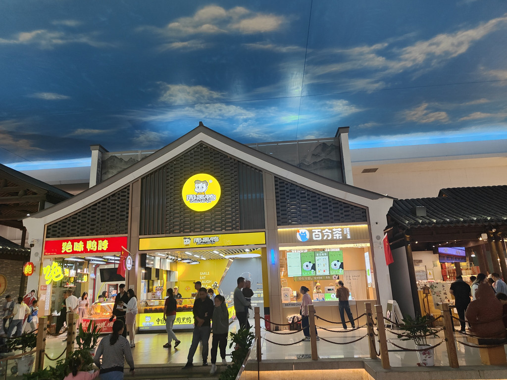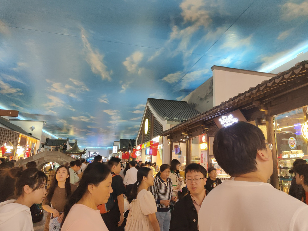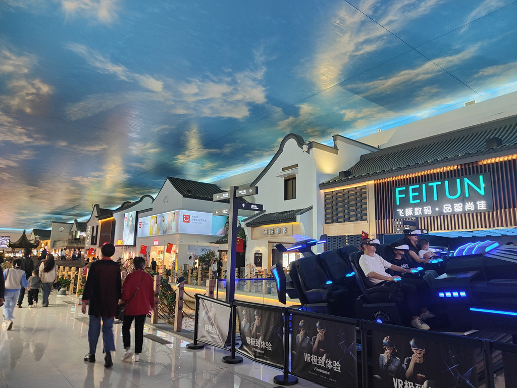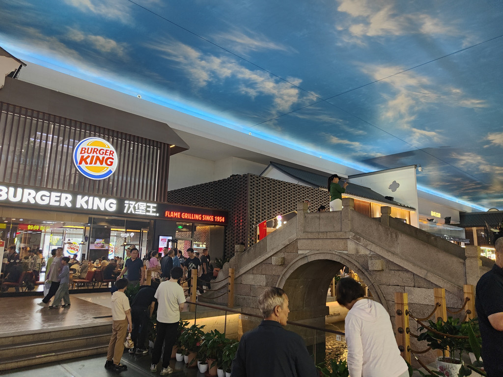 河上架着几座拱桥,两侧店铺林立,还设了仿古的六角小亭,真是把江南水乡的“枕河人家”重现在了服务区。天花板是蓝天白云,倒映在水里,一时几疑如真似幻,不知身在何处。