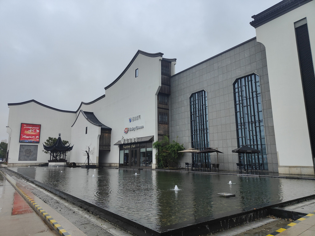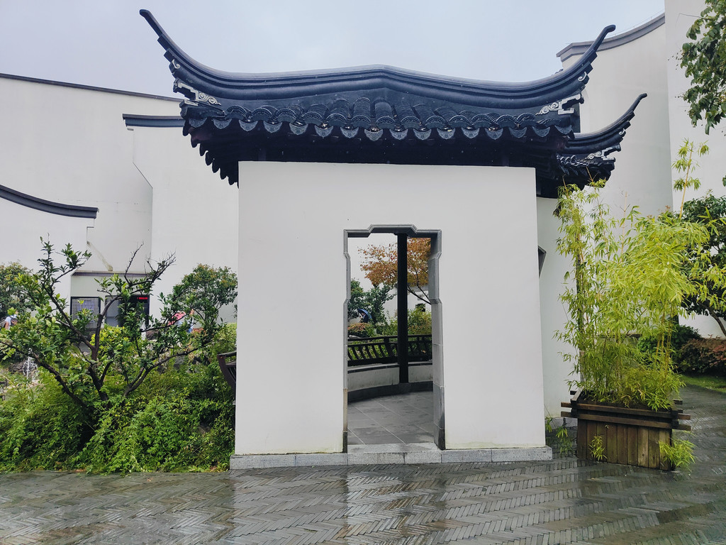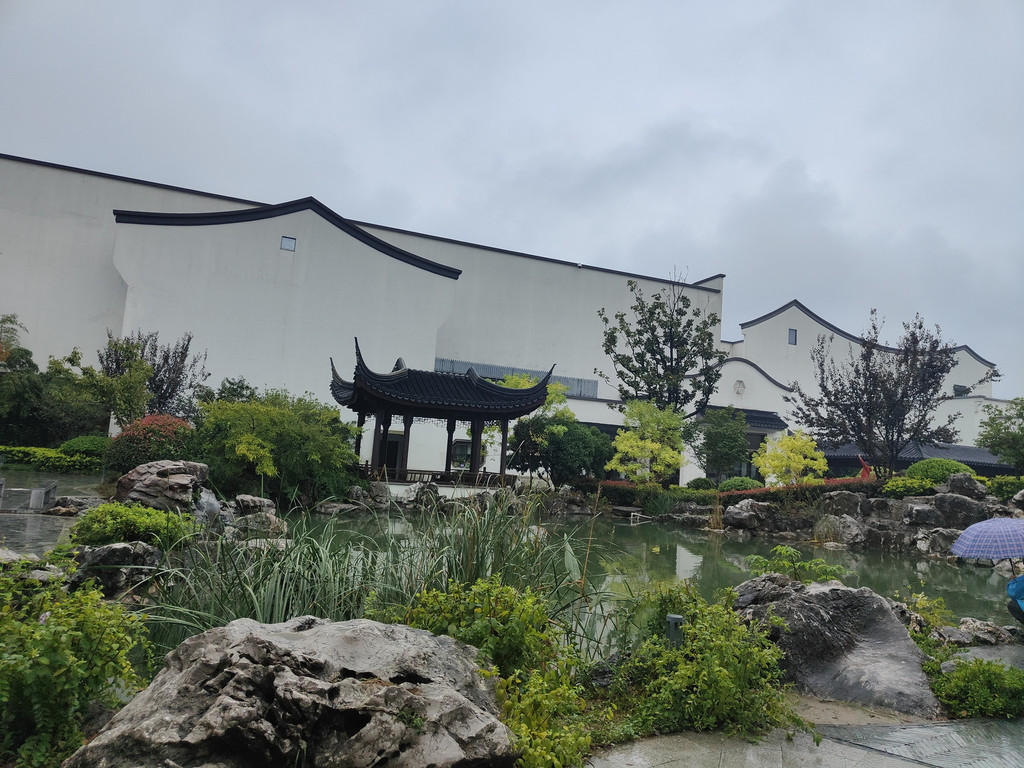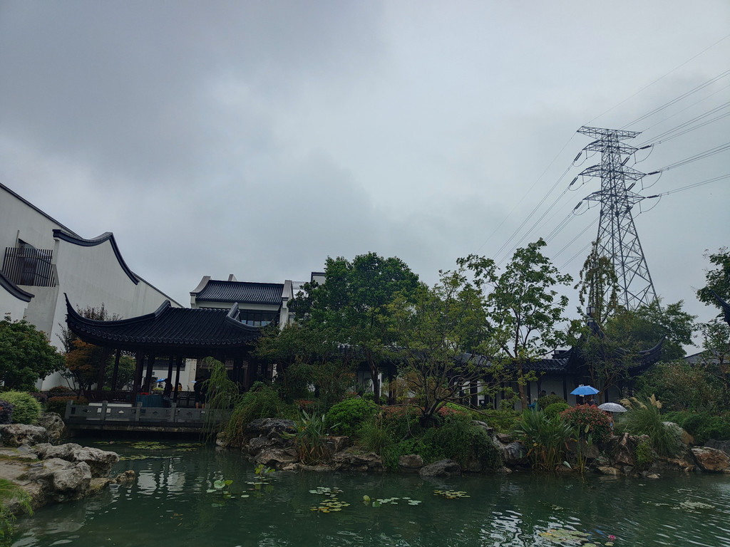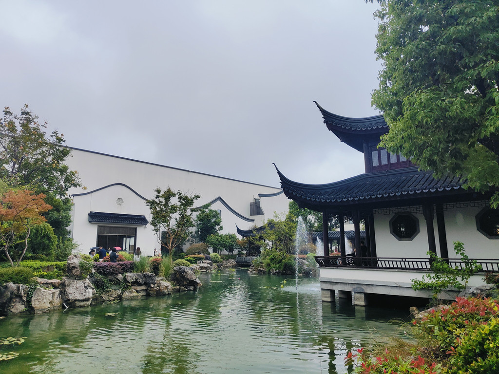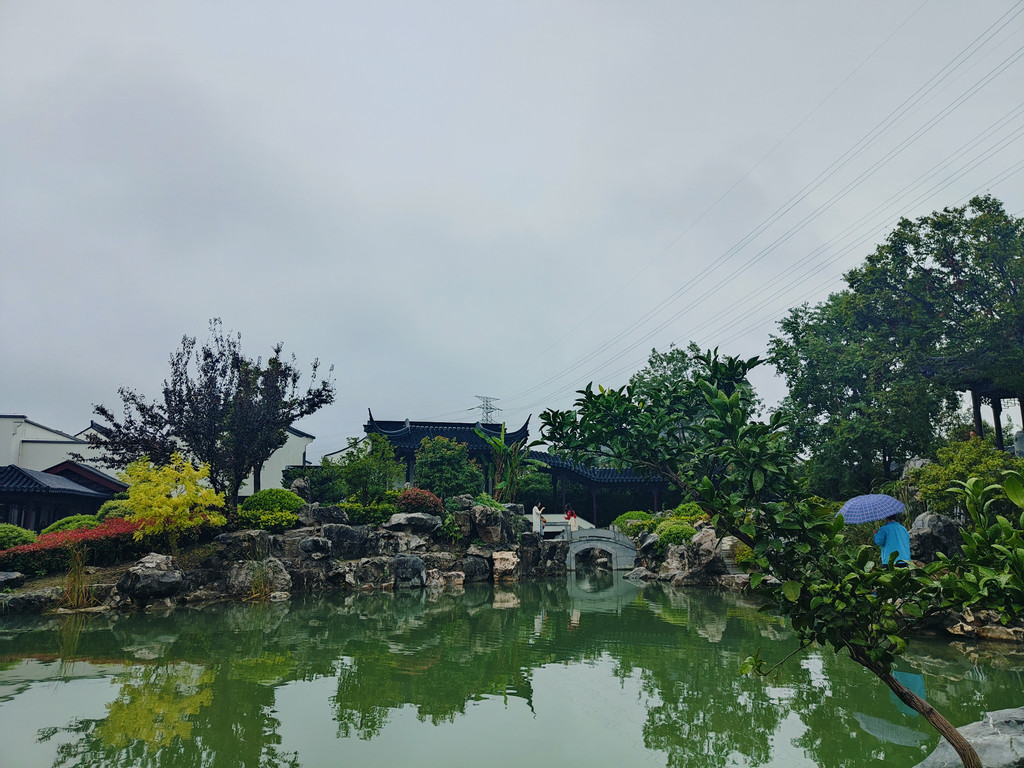 眼前豁然开朗,亭台楼阁浮现在眼前。沿着池塘布局着白墙黛瓦风格的亭台楼阁,都是仿古的建筑,就是苏州园林里常见的布局。