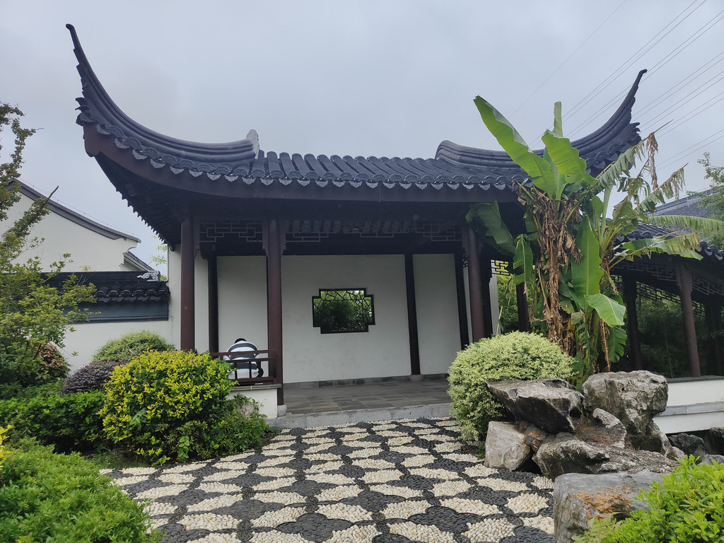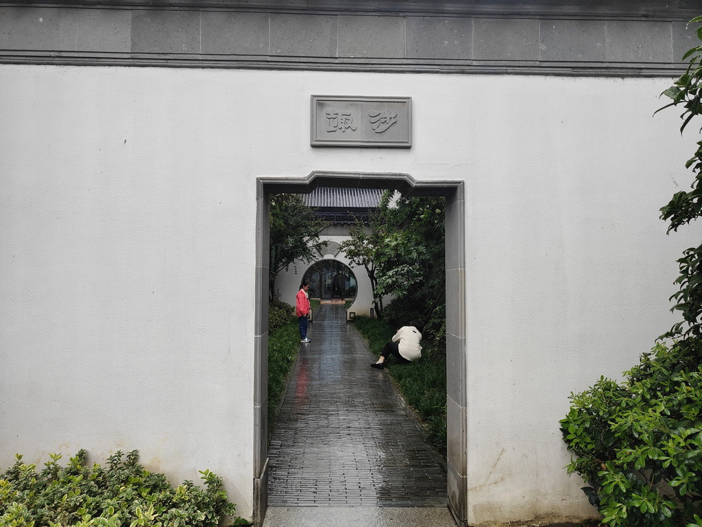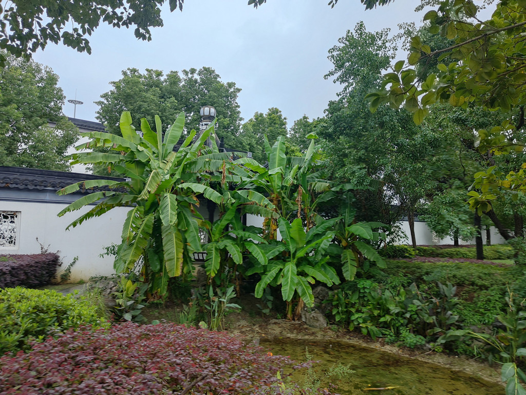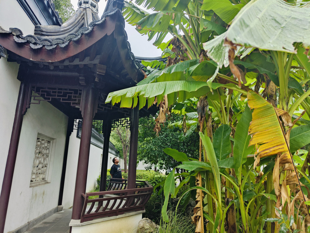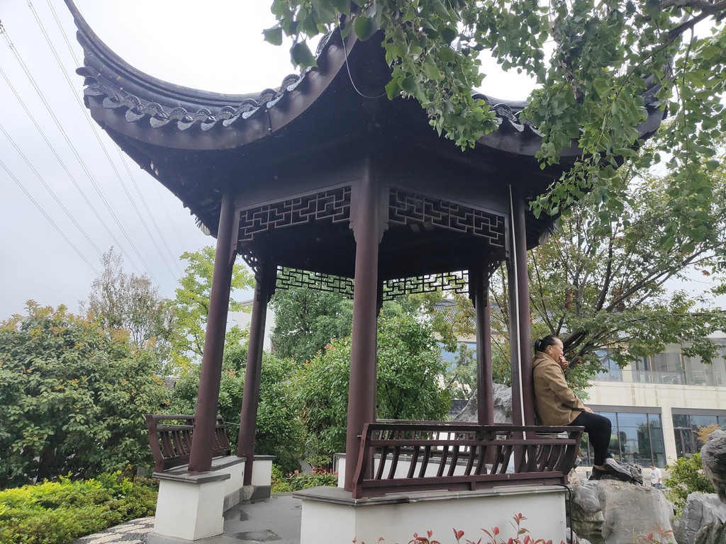 虽然园林不会太大,但建筑各具特色,每一座亭子里或多或少都有人坐着小憩,包括一座依墙而建的半亭。