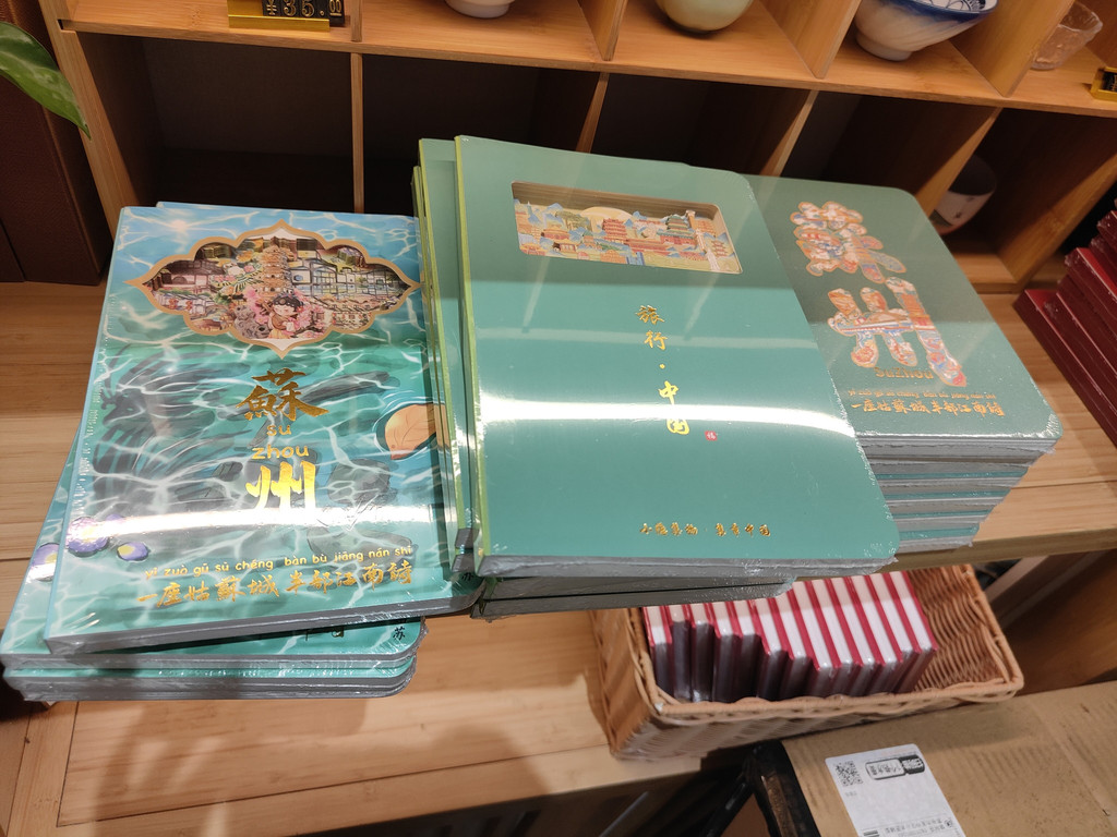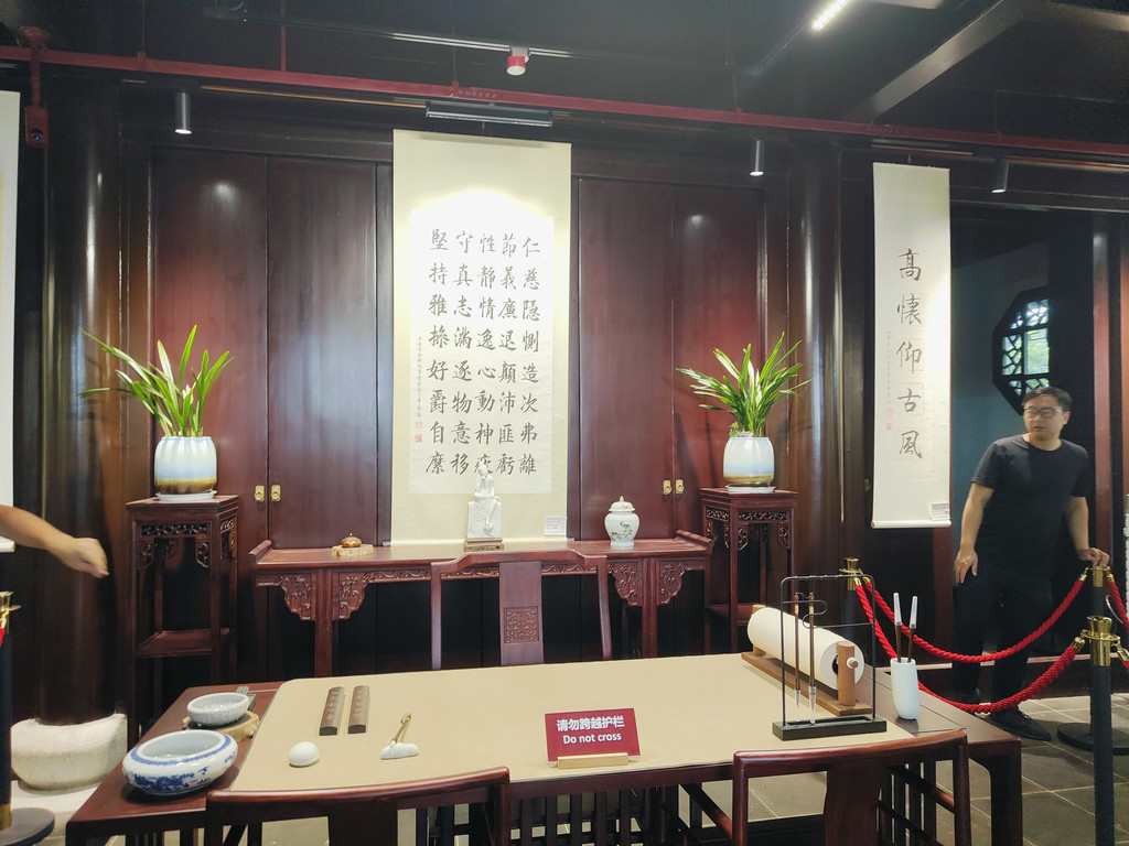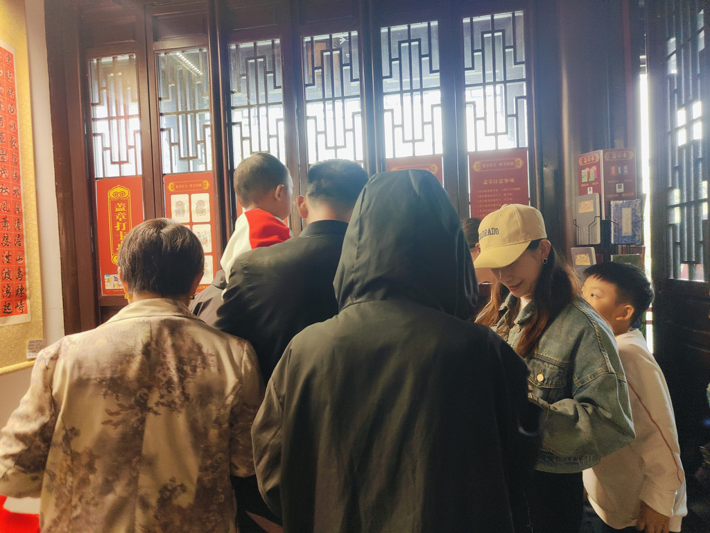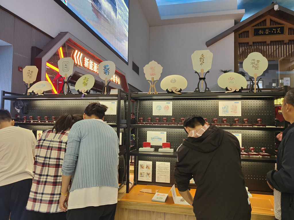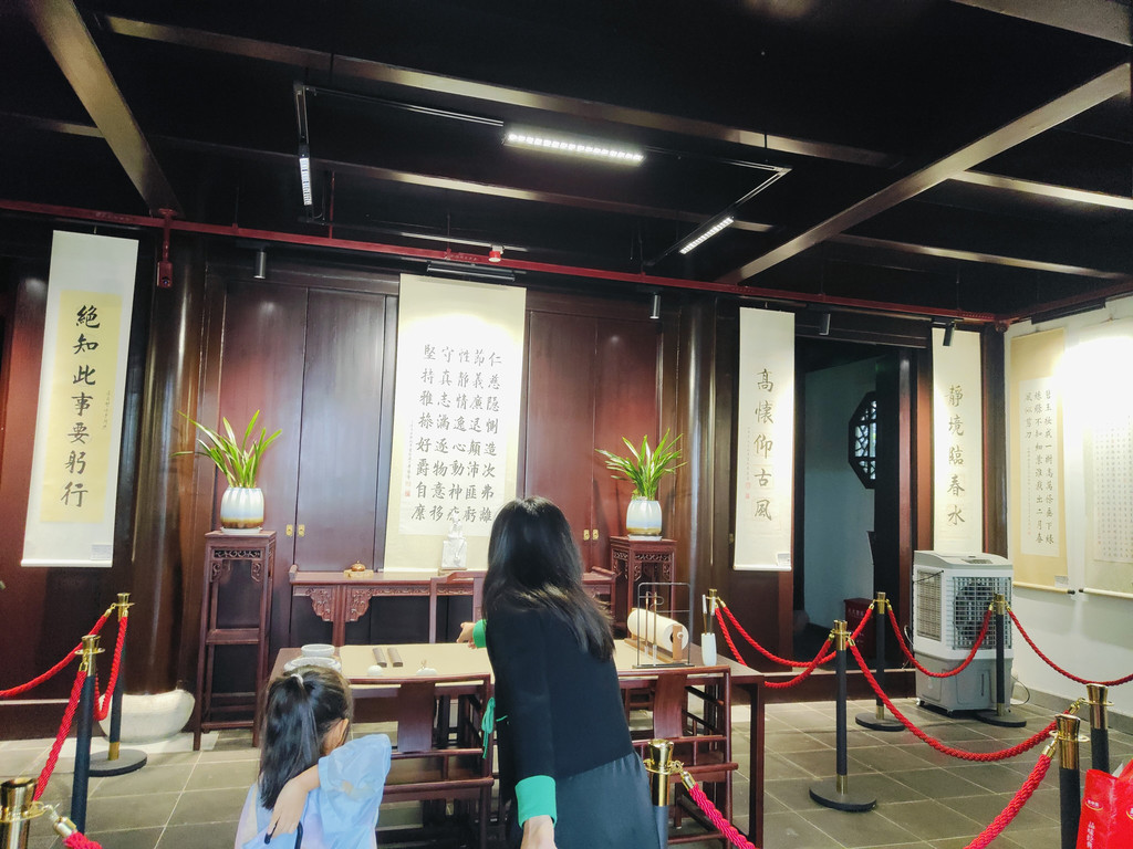 有一座建筑居然还布置了一个书房,墙面上不觉挂着好几幅书法作品。我看到一角挤满了人,好奇地过去看,原来是盖章打卡的,旁边有打卡的小簿子售卖,微信扫码付款,就可以盖上苏州园林的好几款图章。近年来,这种景区盖章打卡的文创产品和形式似乎颇受年轻人的欢迎。