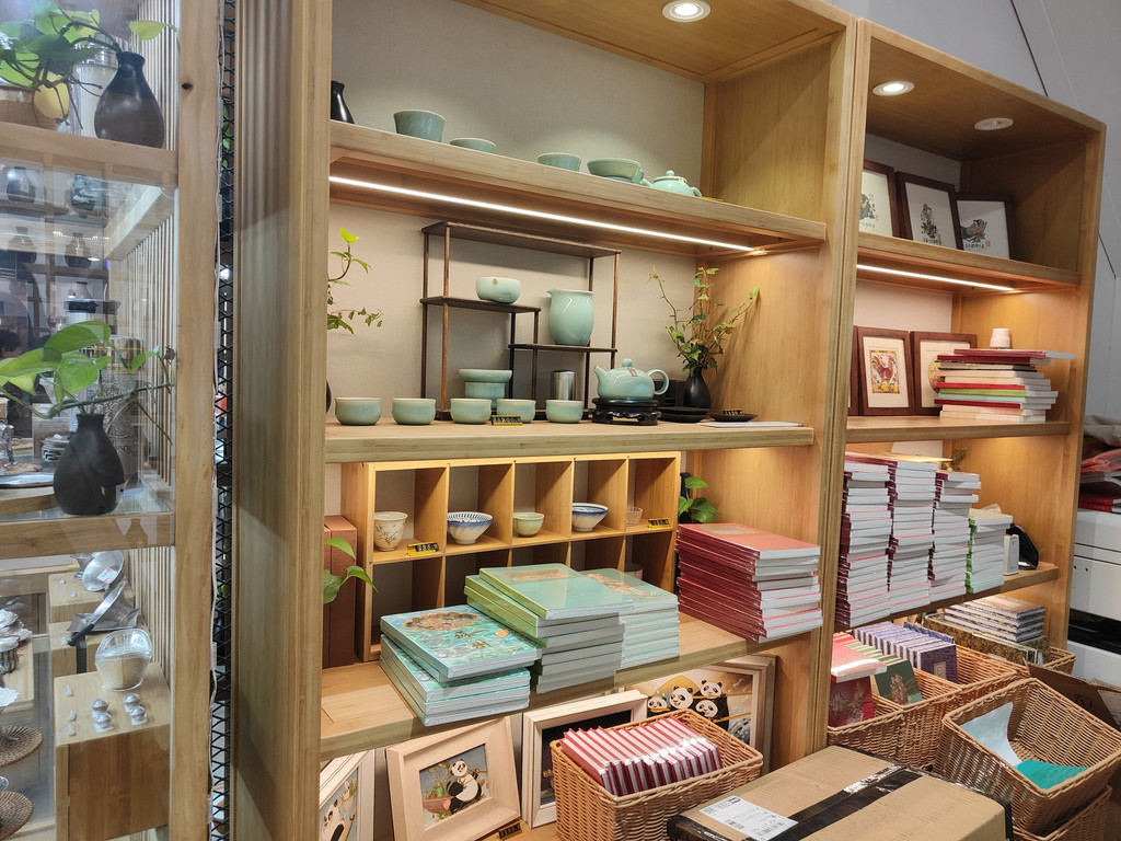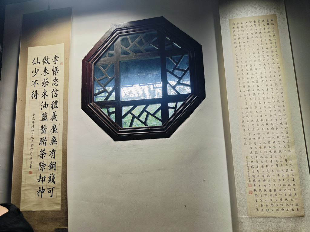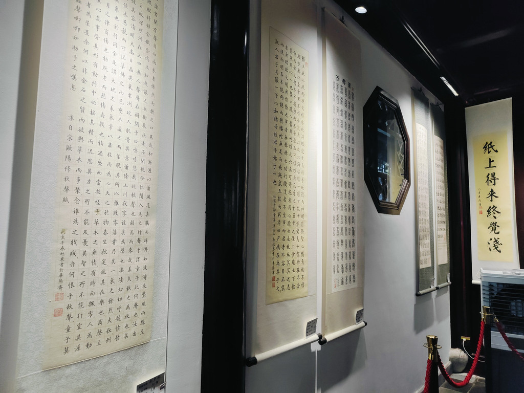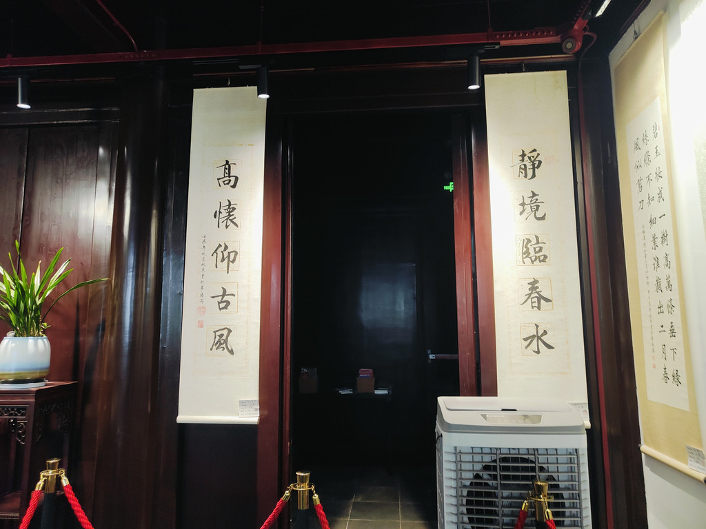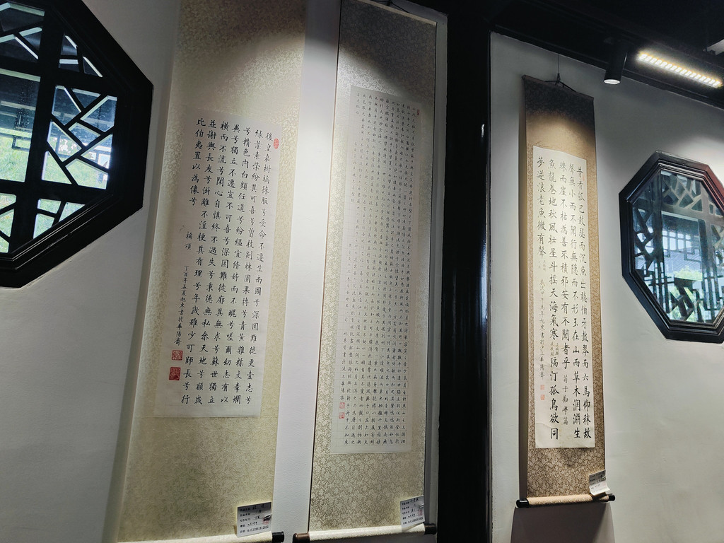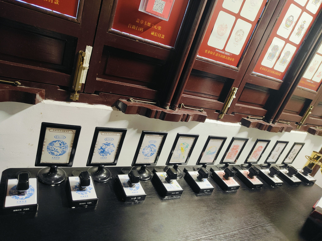 有一座建筑居然还布置了一个书房,墙面上不觉挂着好几幅书法作品。我看到一角挤满了人,好奇地过去看,原来是盖章打卡的,旁边有打卡的小簿子售卖,微信扫码付款,就可以盖上苏州园林的好几款图章。近年来,这种景区盖章打卡的文创产品和形式似乎颇受年轻人的欢迎。