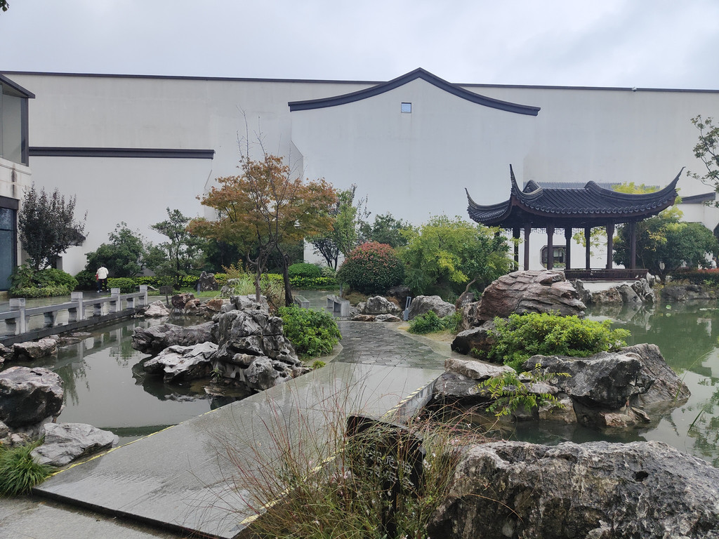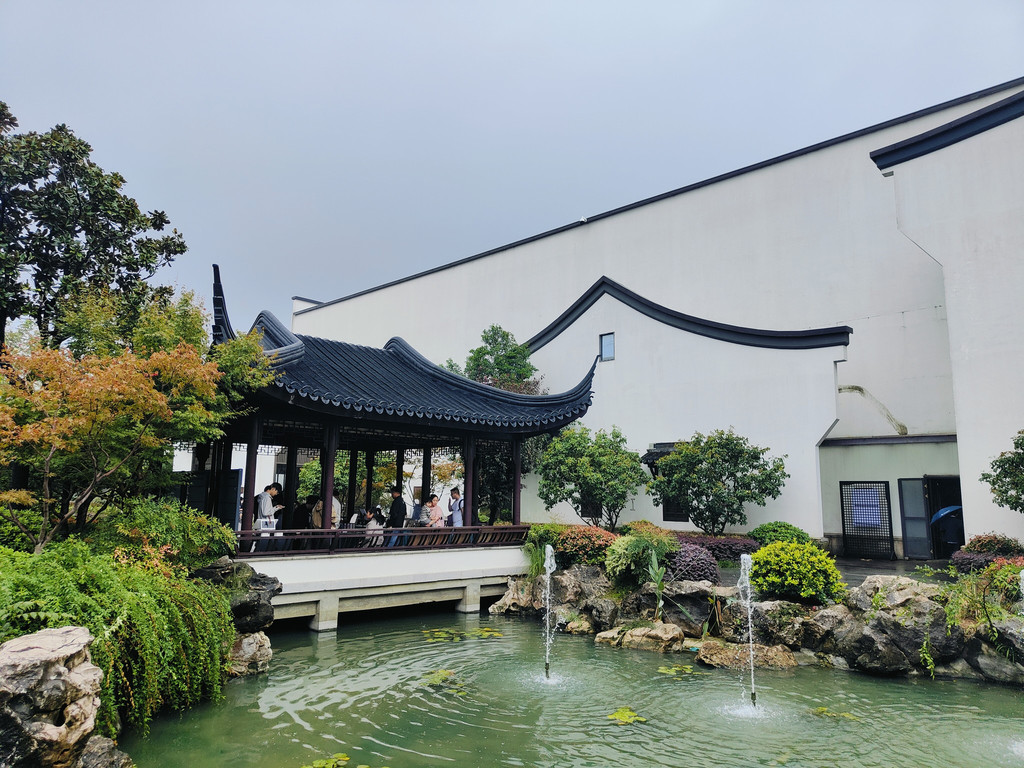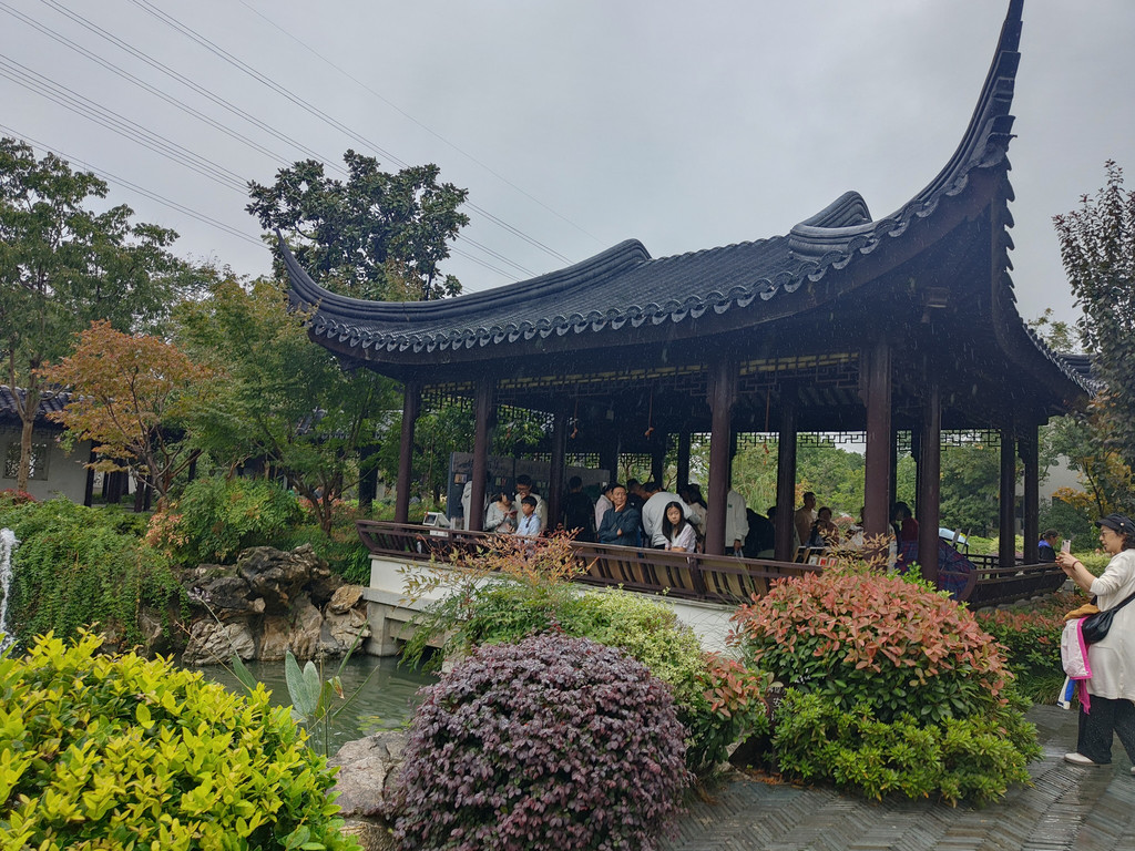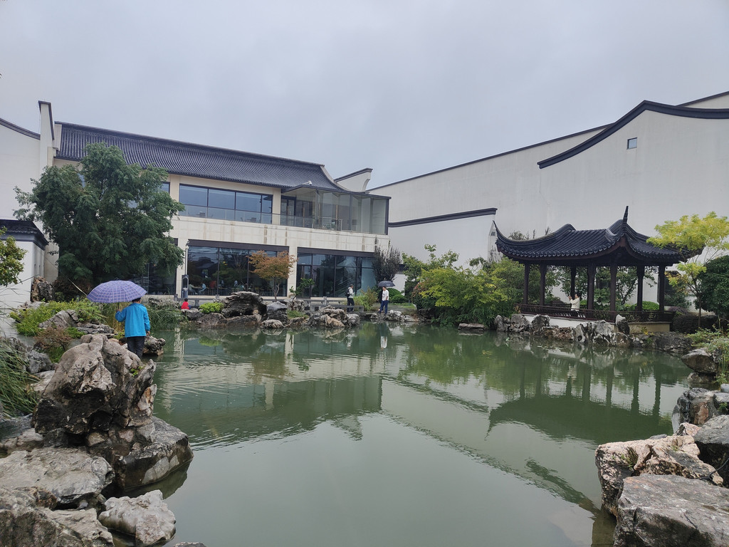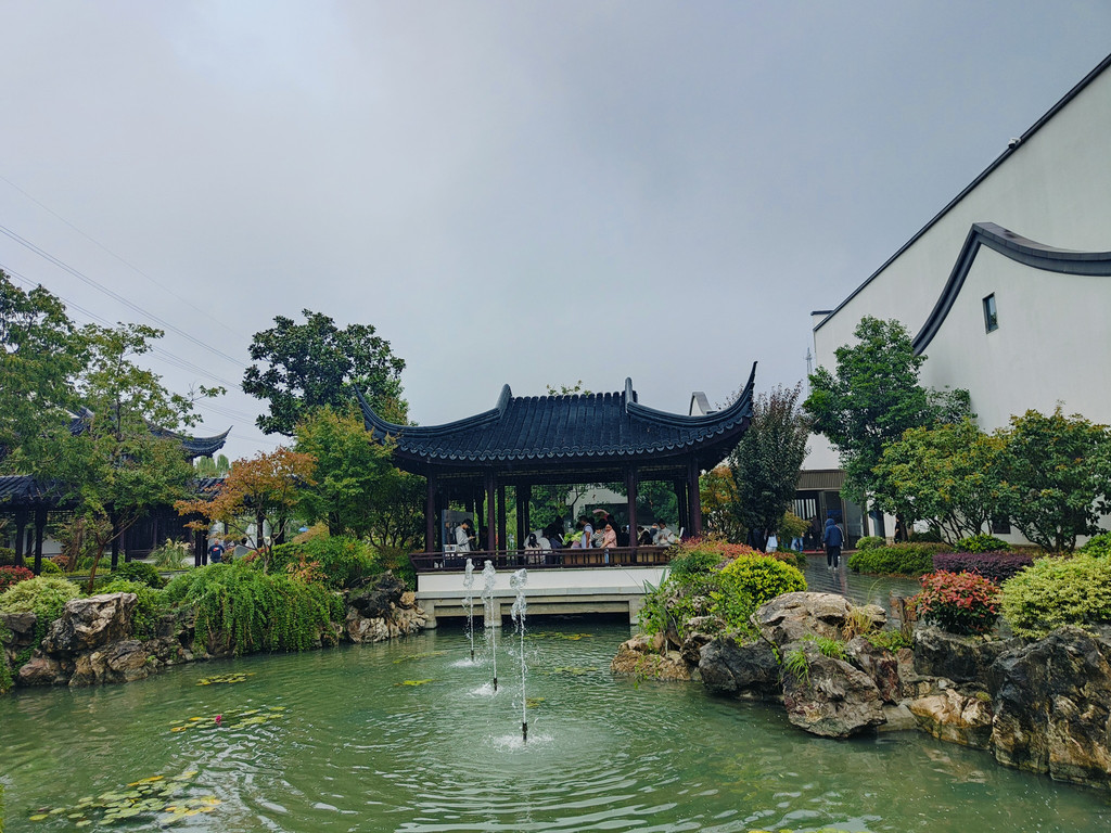 吃完午饭,我们再度游览园林,这次我们直接前往木樨园,这是最能体现苏州园林意味的一座,取的是留园精华部分“涵碧山庄”的景。在东南位开凿水池,西北处假山,主体建筑坐落于水池东南方位,典型的南厅北水格局。东区有一段游廊,西区有一段爬山廊,把木樨园与其他两座园林隔开。池西假山上有一座闻木樨香轩,能俯视全园景色。