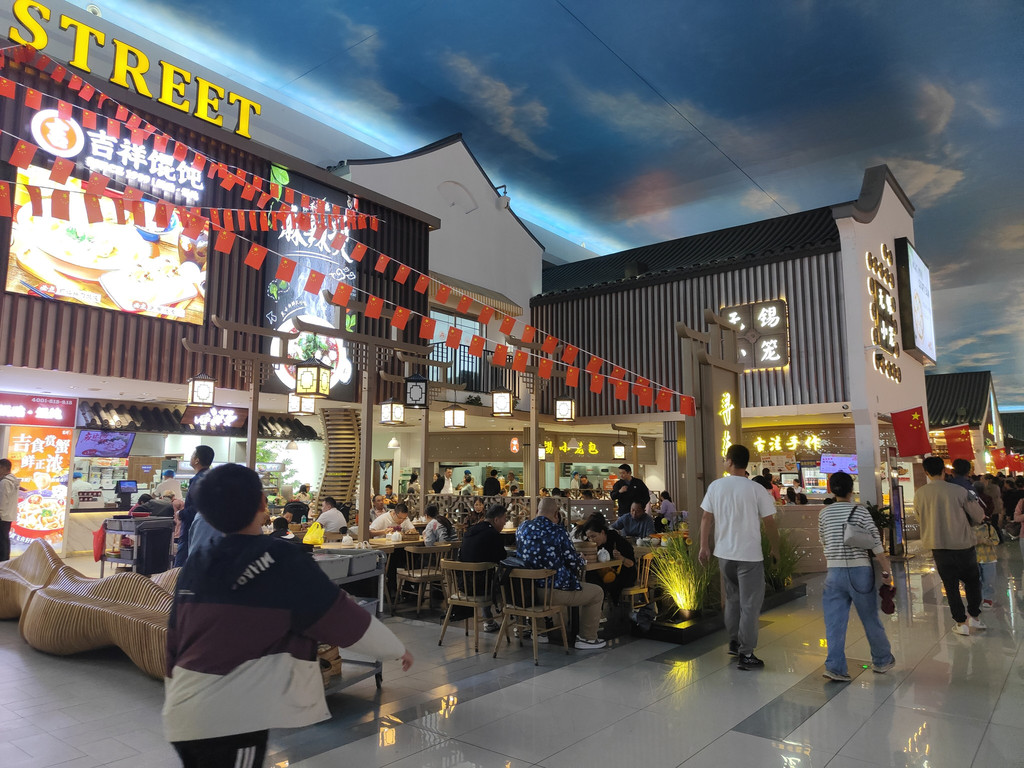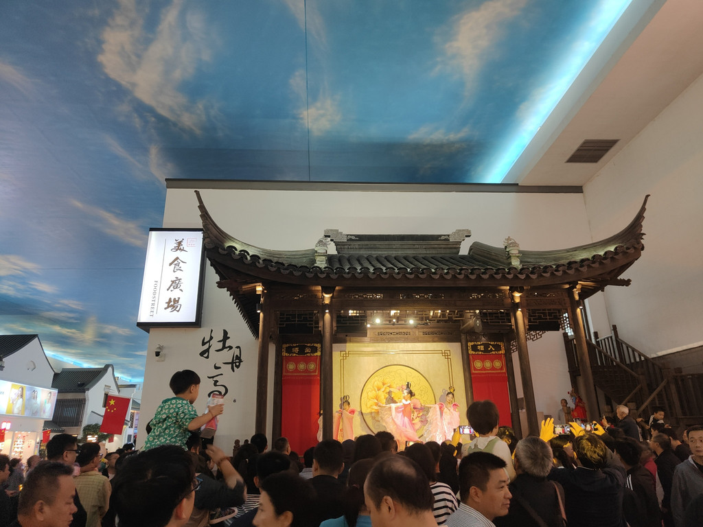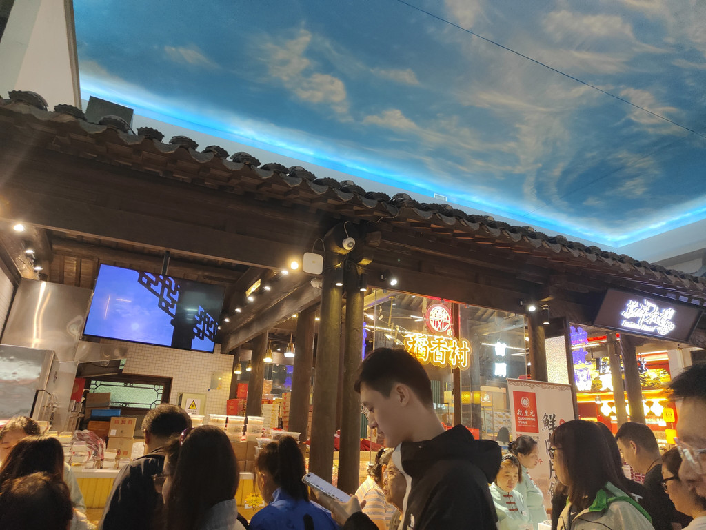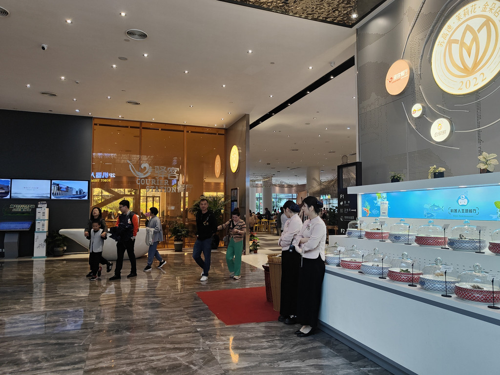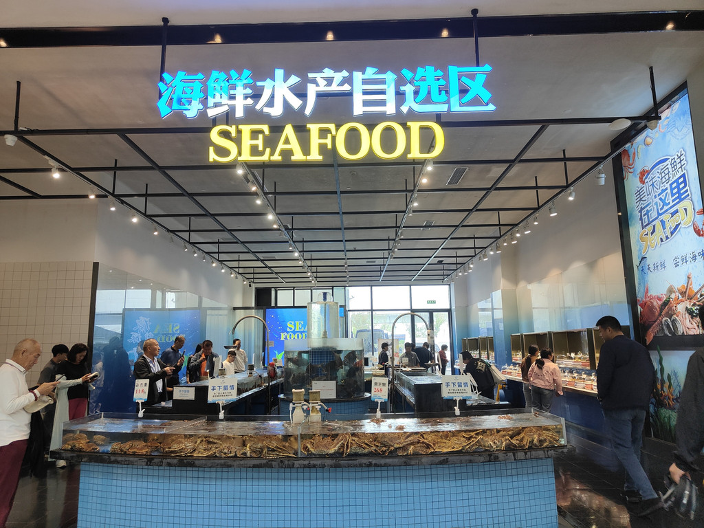 及至同伴终于“抢”到了一张桌子,我们已经看完了两段表演。我们点了吉祥馄饨新出的套餐,有点自嘲,在这里吃这种连锁小吃,也算是节假日的无奈选择了。其实楼上有机器人餐厅,那里的就餐环境相当好,而且由小机器人送餐,很有现代感。楼下还有水产市场,有阳澄湖大闸蟹。不过,今天我们就不要追求美味佳肴了,吉祥馄饨新出的蟹黄飞鱼籽味道也还不错。