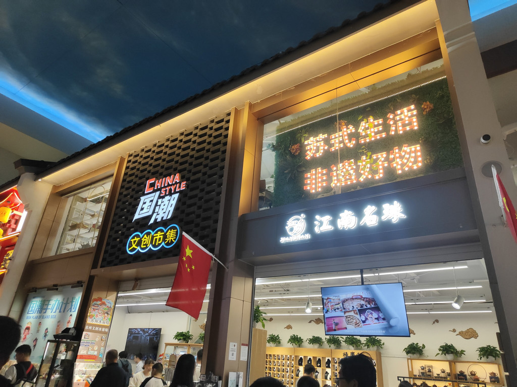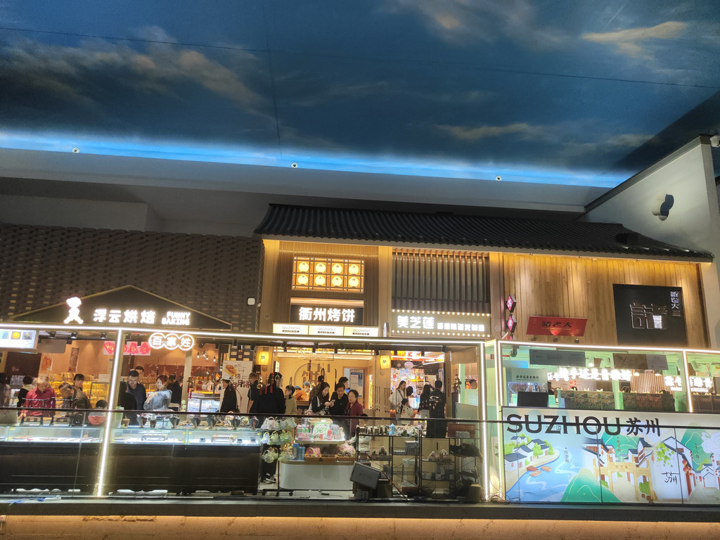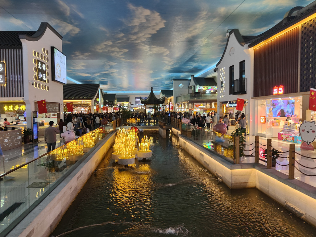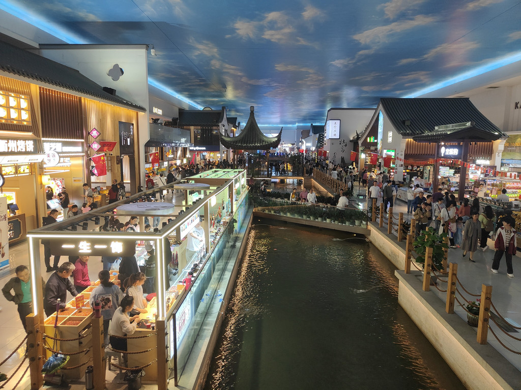 走进去东西走向就是一条古街,苏州把小桥流水人家也搬进了服务区。中间一条小河,虽然在室内,但在灯光的映照下,还是显得波光粼粼。仿佛大自然的画笔,探入到了室内空间,在这里轻轻勾勒出一幅水乡的曼妙画卷。
