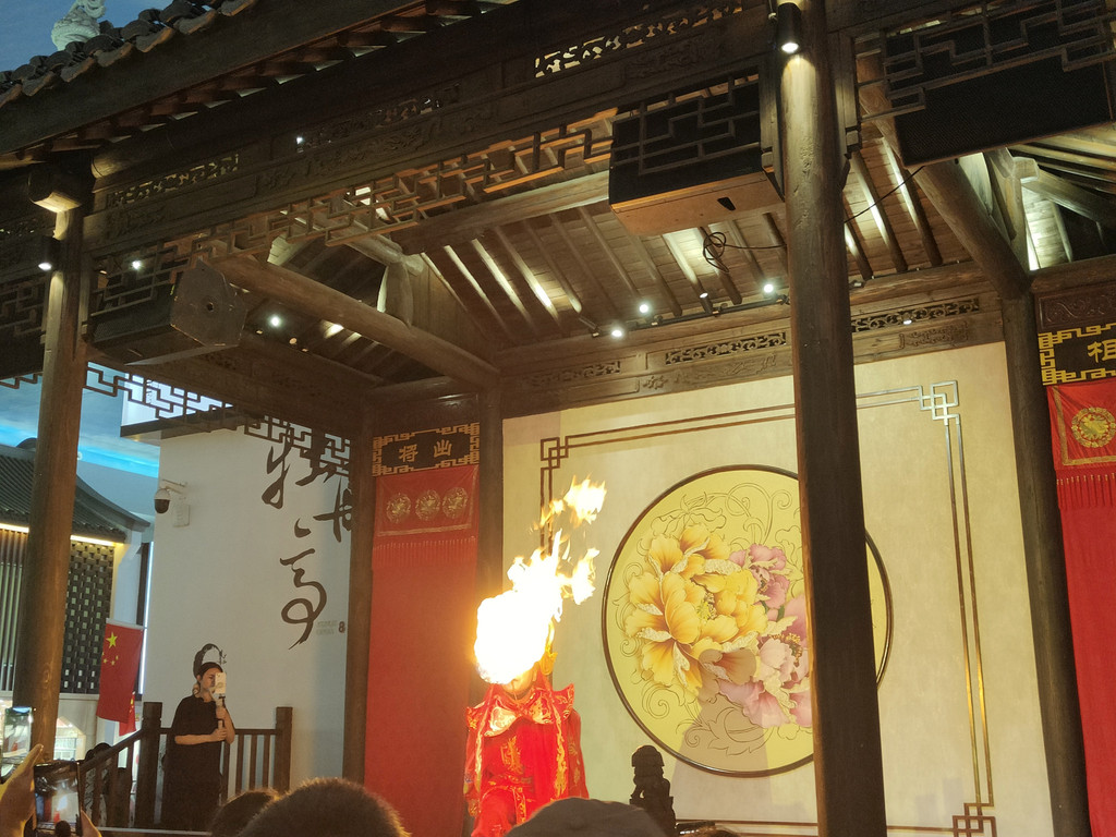 紧接着是喷火表演,戴着脸谱的表演者穿着大红的传统服饰,随着音乐跳舞,不时从嘴中喷出熊熊烈火,让看热闹的观众们发出阵阵喝彩。