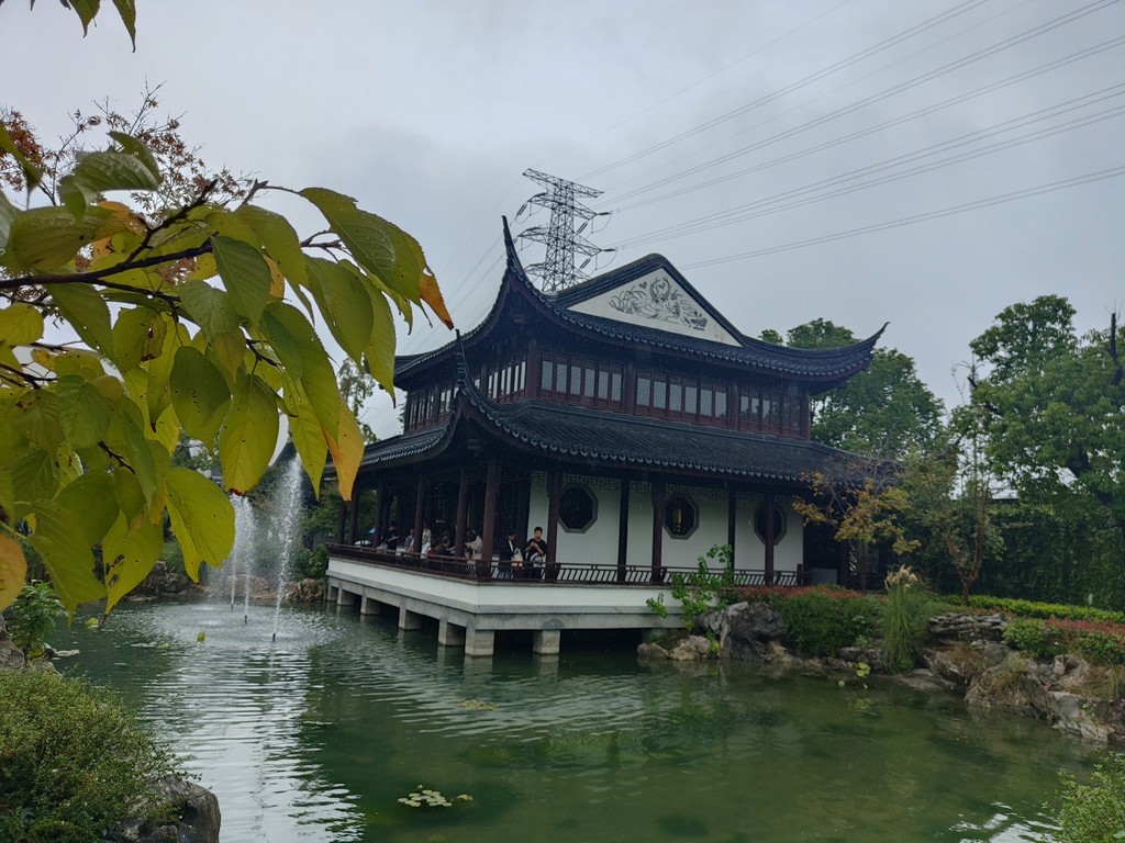 水榭规模居然并不小,但这里已经人满为患。北方的游客尤其稀罕这些景致,江南古典园林的布局,居然不用下高速就能够体会到,还有比这更贴心的设计吗?人们指指点点,诉说着园林里各种建筑。池塘四周植被茂盛,溪石驳岸,一旁还有一片坡地,虽然不甚高,但也让地形有了高低起伏之美。