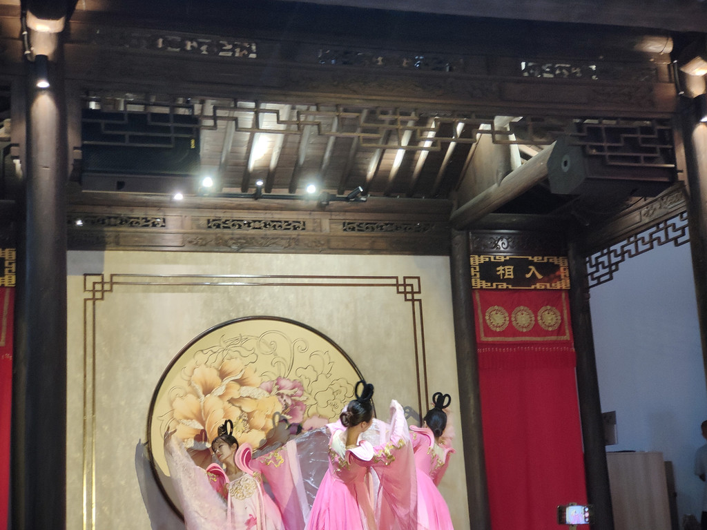留了一人在那里等位置,我们则去舞台看表演了。这时候正在表演舞蹈,演员们穿着轻薄的唐装翩然起舞,我们只能被挤在外围翘首以盼。舞衣轻薄,舞姿飘逸,真是上演了好一曲霓裳羽衣。