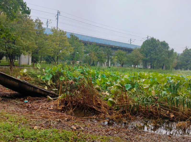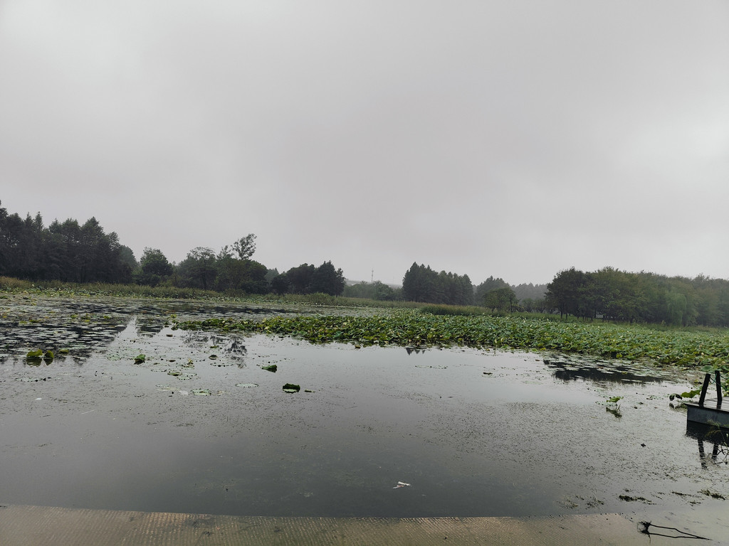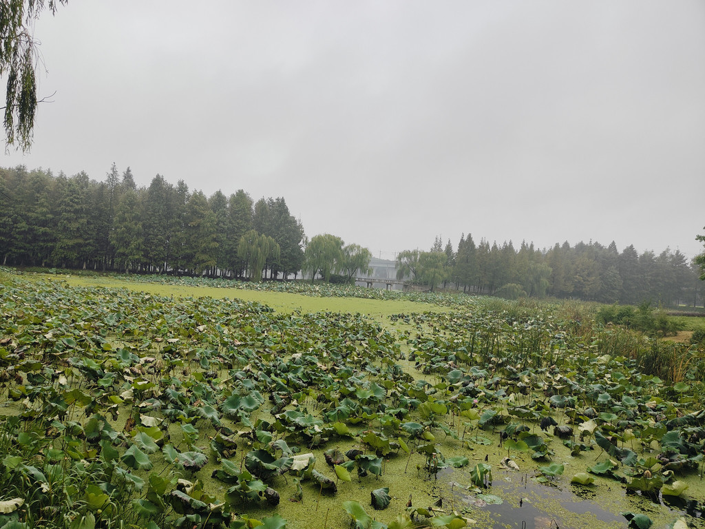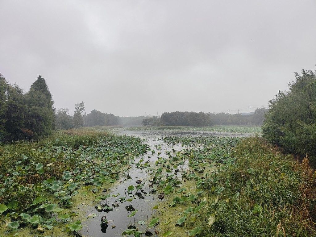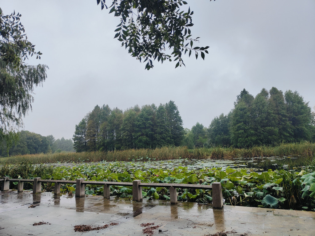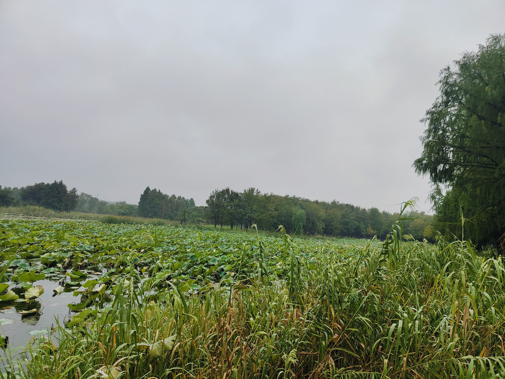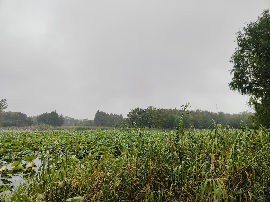 别看这座公园似乎人迹罕至,占地却并不小。池塘不是很大,却栽了满塘的荷,看来阳澄湖一带荷花栽种面积还真不小。雨势虽然不大,但一直没有停,地面有点湿滑,我们回到游步道。