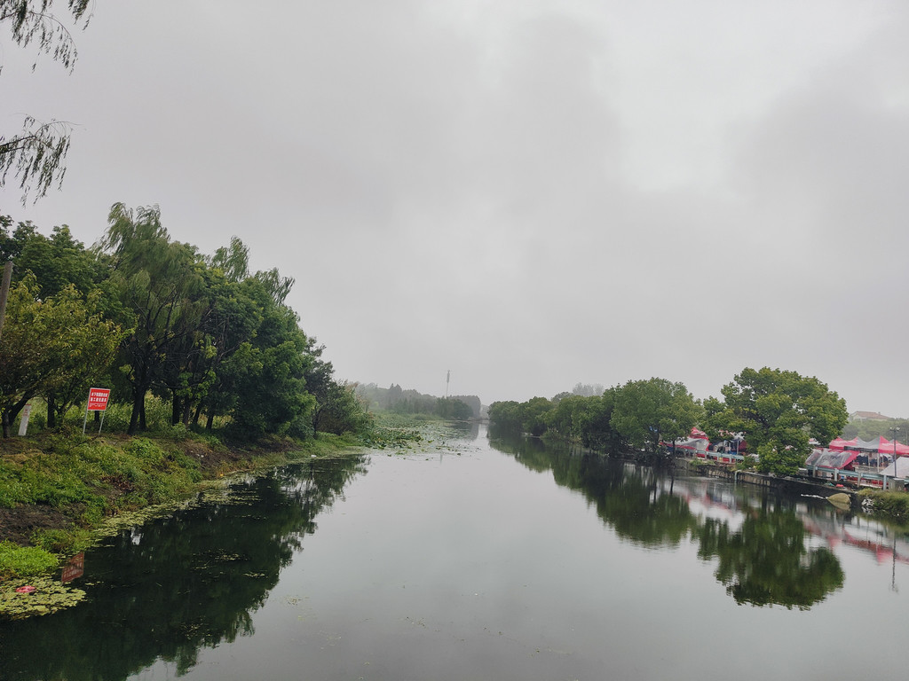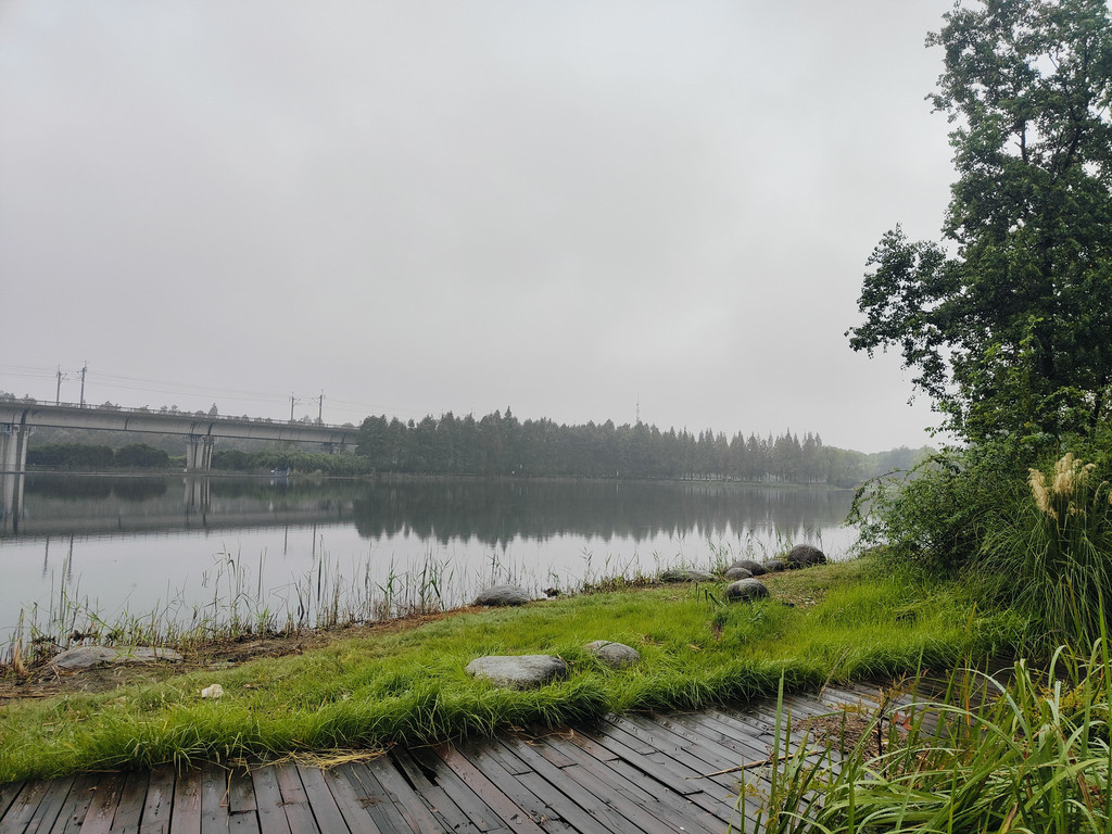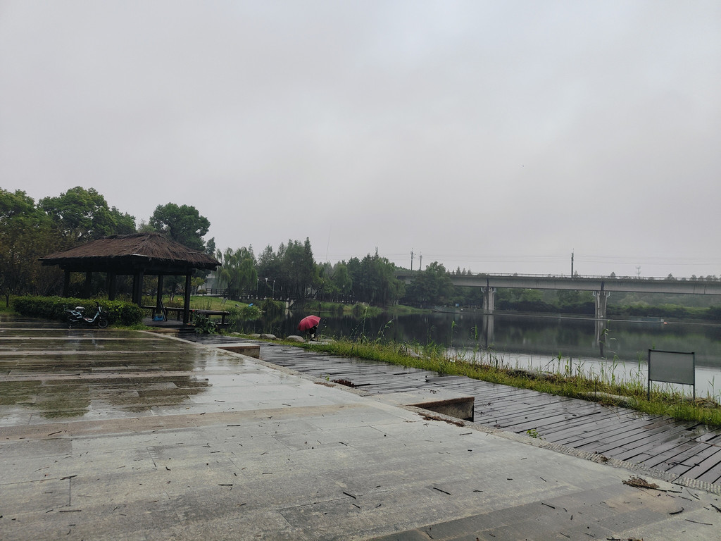 走过池塘,还有一条小河,河畔的亭子并不是常见的仿古式样,而是呈长方形,规模不大,顶覆茅草,很有乡野趣味。这里终于看到了一个人,撑着把伞,静静地坐在河畔,长长的钓竿深入河心。这得有多爱垂钓,才会在下雨天也坚持这项休闲活动。我不由得放轻了脚步,怕惊扰了他静谧安详的小世界。