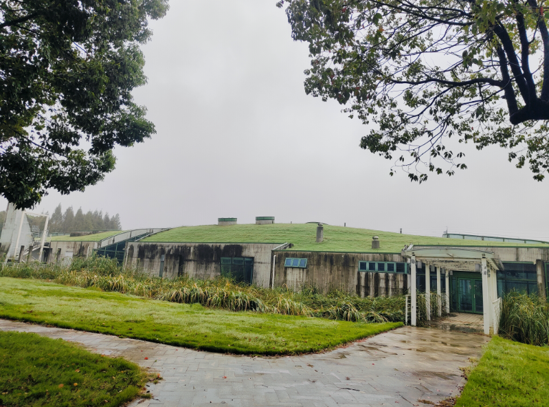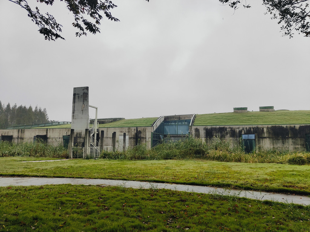 继续往东走,居然看到了一座规模颇大的建筑,有点像以前的厂房,单层,屋顶上覆草坪。窗户很小,我们也没找到上去的地方,不知道这是作什么用的。屋顶是斜面的,虽然草坪看着挺齐整可爱,但也不可能做球场之用。