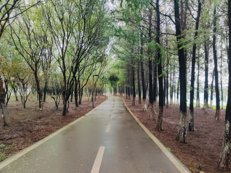 游步道很宽阔,两侧密生着树木,但并不是很大,都是一些速生树种,可见这些树栽种的时间还不长。等到长得大了,必将又是一番风光。