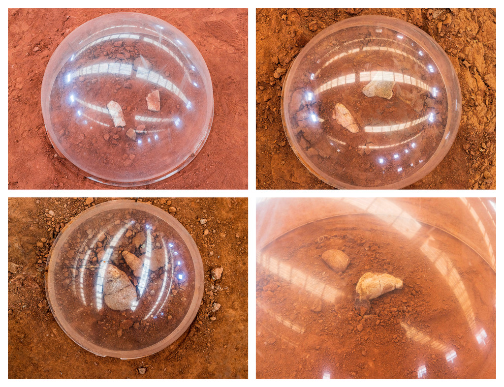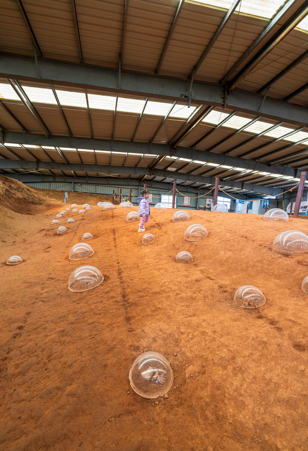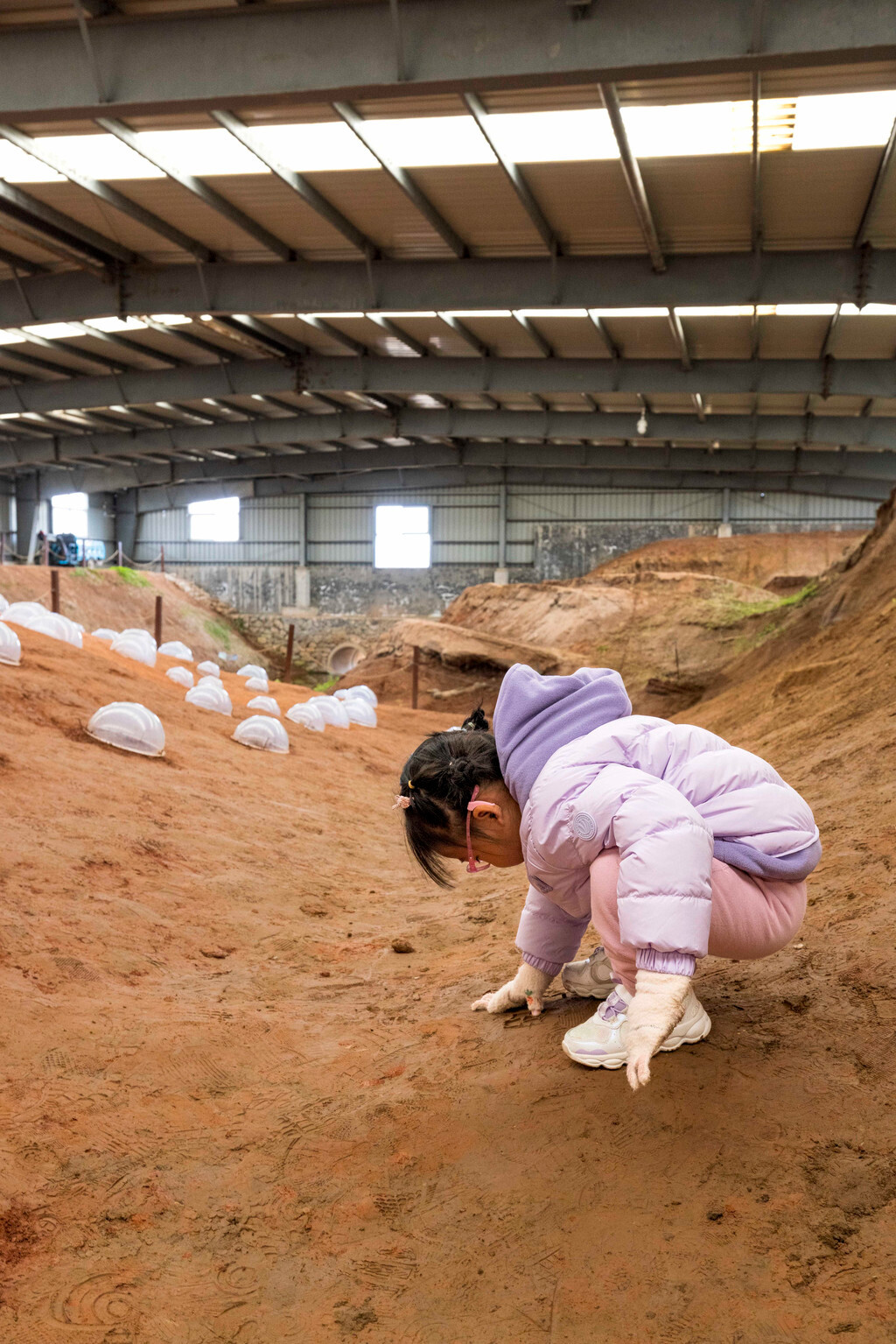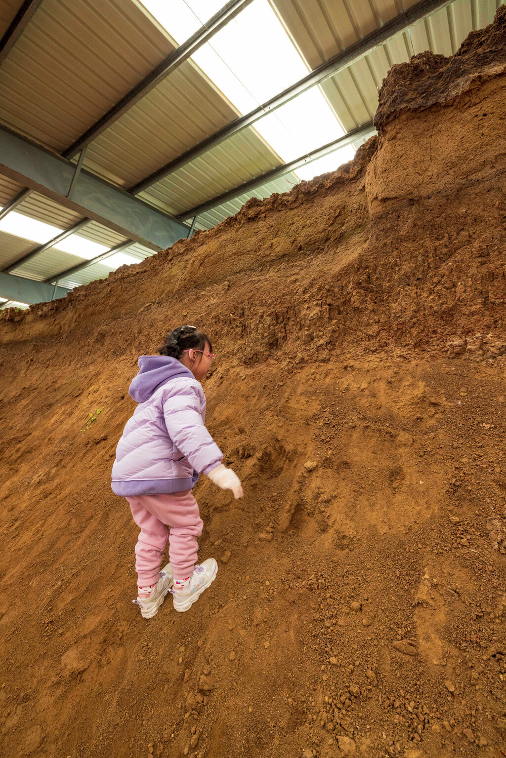 哈妮站在发掘现场,指着喊“恐龙”,不过打听才知道这里半掩着完整的骨骼是复原起到展示效果的,小河对岸被挖掘的比较深,最高处距离地面有个4-5米的样子,能发现这么深的遗迹确实运气和专业都需要并存,而发现了,发掘又更需要专业和耐心。地面罩子里的化石碎片是真的,用于研学等展示。哈妮看后也要在这里发掘恐龙化石,自己翻找这地面希望发现一块化石,地上一无所有时候就爬上斜坡,终于找到一块“化石”(实际是块石头),就迫不及待的研究起来,还要把这个“化石”好好保存在土里,反反复复也是不亦乐乎,甚至还要不断发掘出新的化石来。