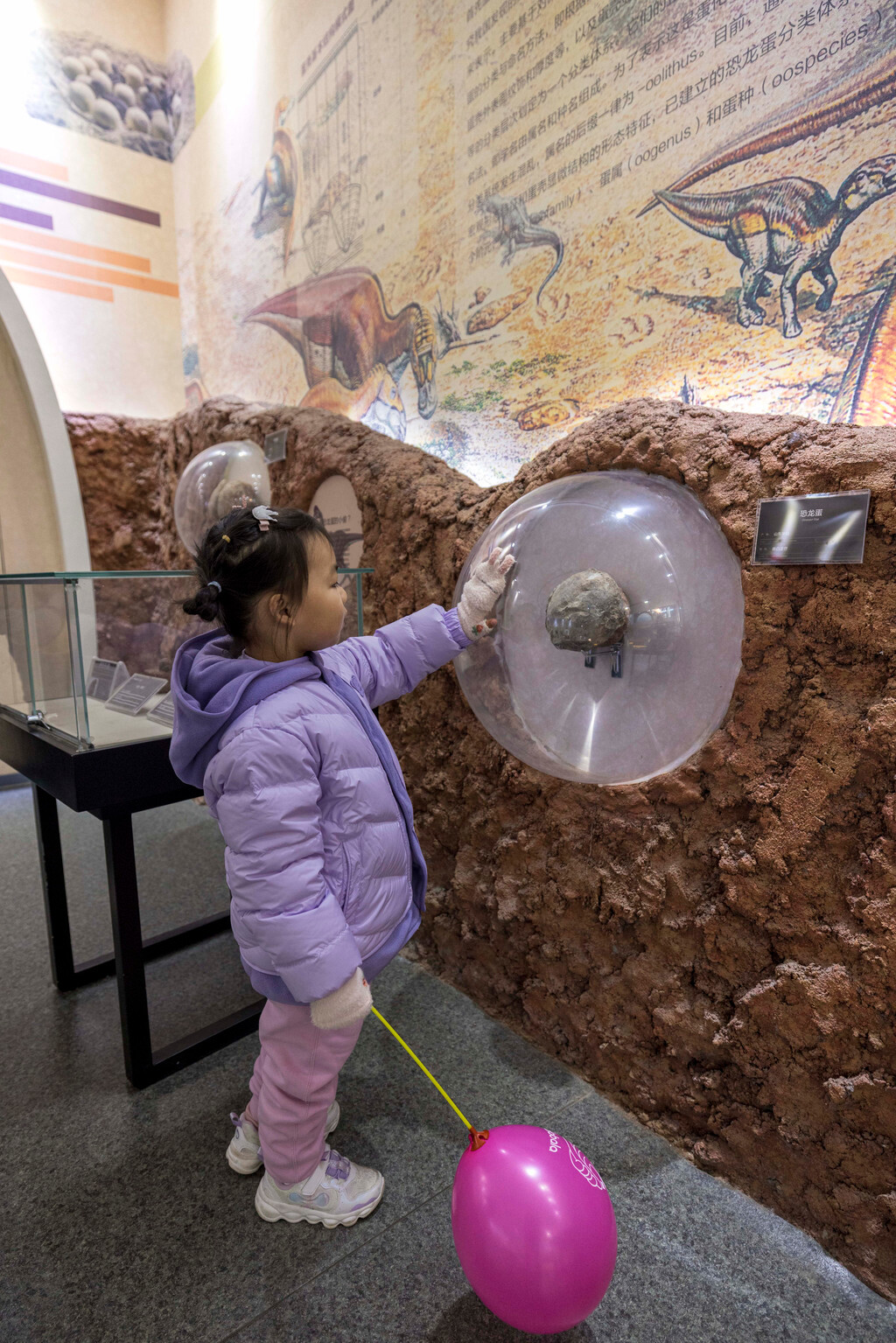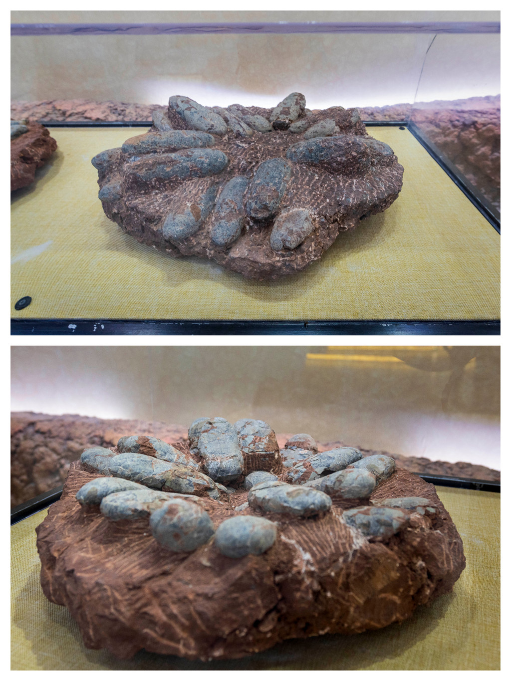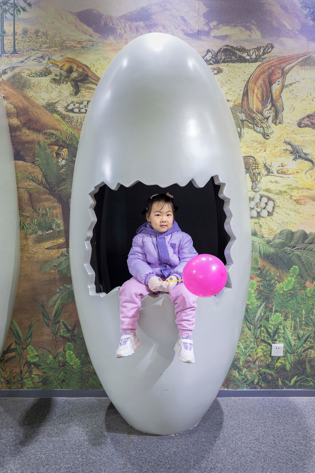 在展馆右手边,陈列着不少恐龙蛋化石,国际上通用的恐龙蛋化石分类和命名方法也是因莱阳恐龙蛋发掘研究提出的,哈妮看到一个破损的恐龙蛋里是亮晶晶的石头,就会问为何没有恐龙宝宝?但是只有伤心的回答。好在哈妮看了很多恐龙的书籍,已经坦然接受悲惨的现实。看到恐龙蛋合影区,更是哈妮的喜爱,假装自己是只恐龙宝宝。